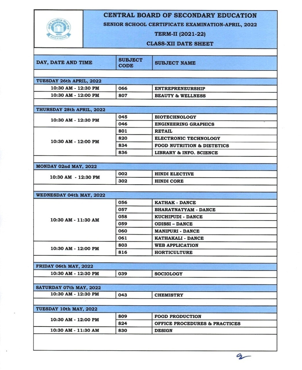 दिल्ली, 11 मार्च: CBSE बोर्डाने बारावीच्या परीक्षेच्या तारखा जाहीर केल्या आहेत. सेंट्रल बोर्ड ऑफ सेकंडरी एज्युकेशनने बारावी Term 2 परीक्षेचं वेळापत्रक(CBSE Date Sheet 2022)त्यांच्या ऑफिशिअल वेबसाइटवर जाहीर केलं आहे. cbse.gov.in किंवा cbse.nic.in या वेबसाइटवर याविषयी सविस्तर माहिती दिलेली आहे. सीबीएससीच्या बारावीची दुसऱ्या टर्मची परीक्षा सब्जेक्टिव्ह स्वरूपाची असणार आहे. कोरोना काळामुळे मागच्या काही परीक्षा ऑनलाइन झालेल्या असल्या तरी ही परीक्षा ऑफलाइनच होणार आहे. 26 एप्रिल 2022 पासून परीक्षेला सुरुवात होईल.