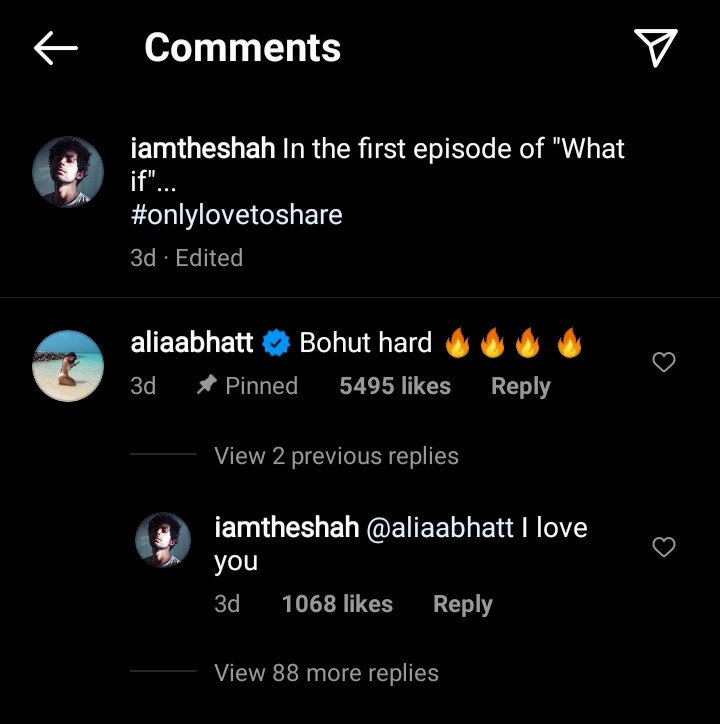 व्हिडीओ पोस्ट झाल्यानंतर आलियाच्या अनेक चाहत्यांनी तिला या पोस्टमध्ये टॅग करायला सुरूवात केली त्यामुळे हा व्हिडीओ तिच्यापर्यत देखिल पोहोचला आणि तिने या पोस्टवर कमेंट देखिल केली. गली बॉय या तिच्या सुपरहीट चित्रपटातील डायलॉग बोलत तिने ‘बहुत हार्ड’ अशी कमेंट केली. यावर त्या रॅपरने आलियाला ‘आय लव्ह यू’ असं म्हणत रिप्लाय दिला.