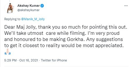 “प्रिय अक्षय कुमार, मी एक माजी गोरखा अधिकारी आहे. त्यामुळे तुम्ही या चित्रपटाची निर्मिती केल्याबद्दल मी सर्वप्रथम तुमचे आभार मानतो. पण तुम्हाला एक महत्त्वाची माहिती द्यायची आहे. या चित्रपटाच्या पोस्टरमधील खुकरी ही व्यवस्थित दाखवावी. खुकरी हे एक धारदार शस्त्र असून त्याची धार ही आतील बाजूला असते. ही तलवार नाही तर खुकरी आहे, जिचा वार आतील बाजूने होतो. यासाठी मी तुम्हाला खुकरीचा एक फोटोही पाठवत आहे. धन्यवाद,” अशा आशयाचे ट्विट जोली यांनी करत अक्षयाला चूक दाखवली आहे.