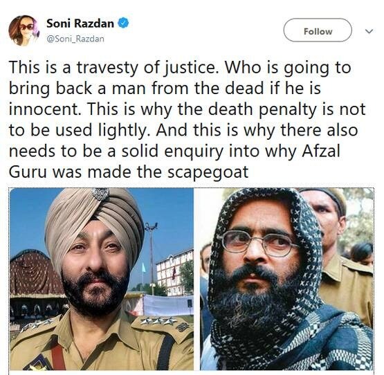 सोनी राजदान यांचं हे ट्वीट सध्या सोशल मीडियावर खूप व्हायरल होताना दिसत आहे. तसेच अनेक युजर्सनी यावर वेगवेगळ्या प्रतिरक्रिया देत सोनी राजदान यांच्यावर टीका केली आहे. सोनी राजदान यांनी अफजल गुरुला बळीचा बकरा म्हटल्यानं सोशल मीडियावर नवा वाद सुरू झाला आहे. काहींनी याबाबत सोनी राजदान यांना समर्थन दिलं आहे. मात्र काही युजर्सनी यावरुन सोनी राजदान यांनी ट्रोल केलं आहे. एका युजरनं लिहिलं, आम्ही गद्दार आणि आतंकवाद्यांच्या मृत्यूवर अश्रू ढाळत नाही. हे जग त्यांच्याशिवायच चांगलं आहे.