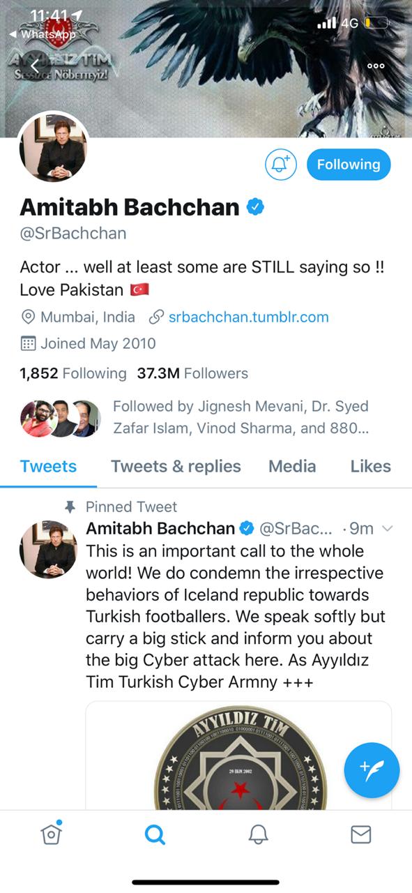 मुंबई, 11जून : बॉलिवूड अभिनेता अमिताभ बच्चन यांचं ट्विटर अकाउंट हॅक करून हॅकर्सनी त्याच्या ट्विटर हँडलच्या प्रोफाइलवर पाकिस्तानचे पंतप्रधान इम्रान खान यांचा फोटो लावला होता. याशिवाय अमिताभ यांचा बायो बदलून त्या ठिकाणी ‘लव्ह पाकिस्तान’ असं लिहिण्यात आलं होतं. हा प्रकार सोमवारी घडला. मात्र हे अकाउंट कोणी हॅक केलं याचा शोध अद्याप लागलेला नाही. पण यामागे पाकिस्तानचं समर्थन करणाऱ्या हॅकरचा हात असण्याची शक्यता वर्तवण्यात येत आहे. अमिताभ बच्चन सोशल मीडियावर खूप सक्रीय आहेत. ते नेहमीच त्यांच्या ट्विटर वरून त्यांचे विचार लोकांशी शेअर करत असतात. तसेच ट्विटर आणि इन्स्टाग्राम या सोशल मीडिया प्लॅटफॉर्मच्या माध्यमातून ते नेहमीच त्यांच्या चाहत्यांच्या संपर्कात असतात. आता त्यांचं ट्विटर अकाउंट हॅक झाल्याची बातमी सोशल मीडियावर वेगानं पसरली आहे. यामुळे नेटक-यांनी ट्रोलींग सुरू केले. इम्रान खानचा फोटो आता तिथे नाहीए तसेच बायो सुद्धा बदलण्यात आला आहे. मात्र अमिताभ बच्चन यांचं ट्विटर पूर्ववत सुरु झालेलं दिसत नाही. कारण अमिताभ यांच्या कडून अद्याप कोणतंही ट्विट करण्यात आलेलं नाही. BHARAT ची ‘ही’ अभिनेत्री दिसली आदित्य ठाकरेंबरोबर