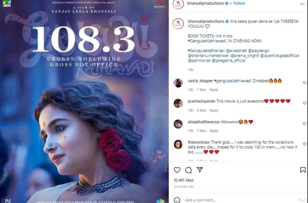 मुंबई, 5 मार्च- आलिया भट्ट (Alia Bhatt) स्टारर ‘गंगुबाई काठियावाडी’ (Gangubai Kathiawadi) हा चित्रपट गेल्या आठवड्यातच प्रदर्शित झाला असून या चित्रपटाने बॉक्स ऑफिसवर खळबळ माजवली आहे. या चित्रपटाला प्रेक्षक आणि समीक्षकांकडून भरभरून दाद मिळत आहे. गंगुबाई काठियावाडी चित्रपटगृहात एक आठवडा पूर्ण झाला आहे. यासोबतच चित्रपटाने 100 कोटींचा टप्पाही पार केला (Box Office Collection) आहे. भन्साळी प्रॉडक्शनच्या अधिकृत इन्स्टाग्राम अकाऊंटवरून चित्रपटाचं पोस्टर शेअर करत ही माहिती देण्यात आली आहे. शेअर केलेल्या पोस्टच्या कॅप्शनमध्ये लिहिलं आहे, “इतकं प्रेम दिल्याबद्दल धन्यवाद.” तसेच सर्वांना माहिती देत भन्साळी प्रॉडक्शनने शेअर केलेल्या पोस्टमध्ये लिहिलं आहे की, या चित्रपटाने जगभरात 108.3 कोटी रुपयांची कमाई केली आहे.तर दुसरीकडे, आलिया भट्टनेदेखील आपल्या इन्स्टाग्राम अकाऊंटवर एक व्हिडिओ शेअर केला आहे आणि लिहिलं आहे - ‘अभिनेत्री बनण्यासाठी आली होती गंगू, परंतु इथे तर पूर्ण चित्रपटच बनला’. देशात सुरु असलेल्या कोरोना महामारीच्या हाहाकारनंतर हा चित्रपट एक ब्लॉकबस्टर चित्रपट ठरला आहे’. आलिया भट्ट, शंतनू माहेश्वरी, अजय देवगण सीमा पाहवा आणि विजय राज यांच्या प्रमुख भूमिका असलेला संजय लीला भन्साळी दिग्दर्शित हा चित्रपट सर्वांच्याच चर्चेचा विषय ठरला आहे. या चित्रपटाने रिलीजपूर्वीचा सोशल मीडियावर हवा केली होती. परंतु कोरोना महामारीमुळे चित्रपट पुढे ढकलला जात होता. बॉक्स ऑफिस कलेक्शन- गंगुबाई काठियावाडीने पहिल्या आणि दुसऱ्या दिवशी अनुक्रमे 10.50 कोटी आणि 13.32 कोटी रुपयांची कमाई केली होती. यानंतर तिसऱ्या दिवशी 15.30 कोटी रुपयांची कमाई झाली होती. तर चौथ्या दिवशीच्या कमाईत काहीशी घट झालेली दिसून आली. चौथ्या दिवशी या चित्रपटाने 8.19 कोटींची कमाई केली होती. बुधवारी चित्रपटाच्या कमाईत घसरण झाली आणि 6.21 कोटींची कमाई केली.त्यांनतर एकूण आकडा पाहता या चित्रपटाने आता 108.3 कोटी रुपयांची कमाई केली आहे.सोबतच हा चित्रपट 100 कोटी क्लबमध्ये सहभागी झाला आहे.