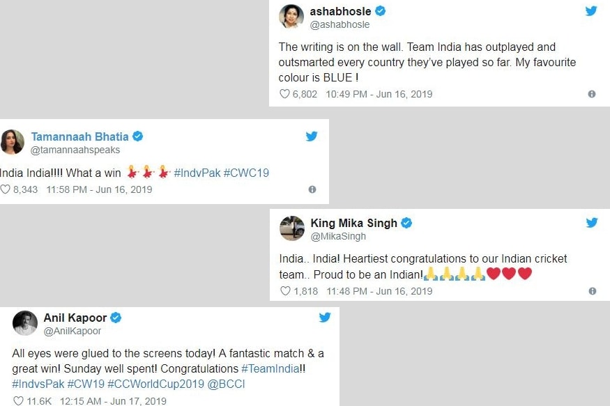 या फोटोला कॅप्शन देताना सलमानने लिहिले की, ‘भारताच्या टीमला ‘भारत’कडून हार्दिक शुभेच्छा.’ सलमानसोबतच आशा भोसले यांनी शुभेच्छा देत म्हटलं की, ‘टीम इंडियाने आतापर्यंत जेवढे सामने खेळले त्यात सगळ्याच देशांचा दारूण पराभव केला. माझा आवडता रंग निळा आहे.’ तर तमन्ना भाटियाने लिहिले की, ‘इंडिया.. इंडिया.. वा काय जिंकलो!’ मिका सिंगने लिहिले की, ‘इंडिया.. इंडिया… आपल्या क्रिकेट टीमला मनापासून शुभेच्छा. भारतीय असल्याचा मला अभिमान आहे.’ तर अनिल कपूर यांनी ट्वीट करत म्हटलं की, ‘आज सगळ्यांच्या नजरा टीव्हीलाच खिळल्या आहेत. एक अप्रतिम सामना आणि सुरेख विजय. रविवार चांगला गेला. शुभेच्छा.’ रोहित शर्मा ठरला भारताच्या विजयाचा शिल्पकार, इतर महत्त्वाच्या 18 बातम्या
