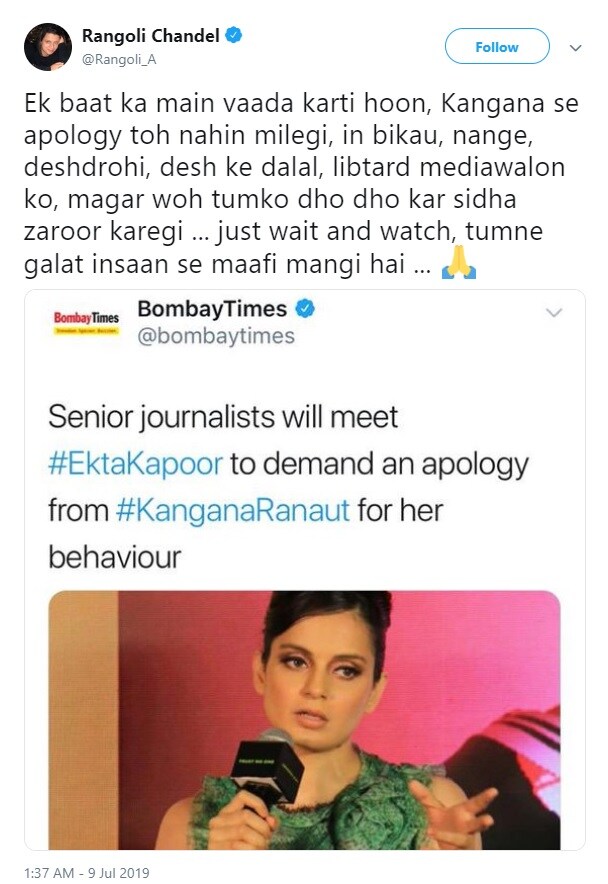 VIDEO : सोशल मीडियावर व्हायरल होत असलेली ‘ही’ निरागस गायिका आहे तरी कोण? यानंतर सर्व स्तरातून कंगनानं त्या पत्रकाराची माफी मागावी अशी मागणी होऊ लागली तसेच तिच्यावर खूप टीकाही झाली. यावर शांत बसेल ती कंगनाची बहीण कसली. तिनं सुद्धा तिच्या सोशल मीडिया अकाउंटवरून मीडियासाठी अनेक अपशब्दाचा वापर करत कंगना कोणत्याही प्रकारची माफी मागणार नाही उलट तुम्हाला पकडून पकडून मारेल. तुम्ही चुकीच्या व्यक्तीकडून माफीची मागणी केली आहे असं बरंच काही लिहिलं.