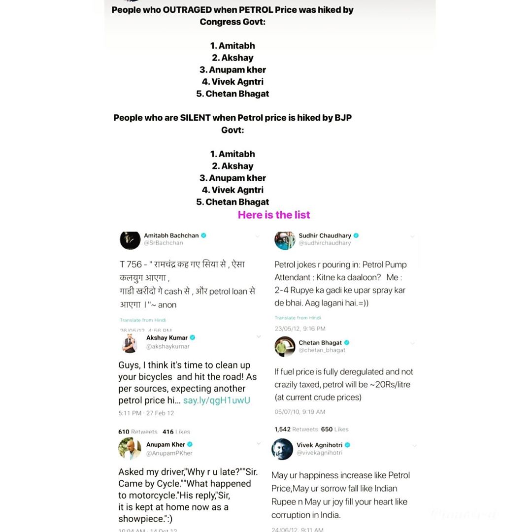 मुंबई, 07 जुलै- उत्तर प्रदेशचे मुख्यमंत्री योगी आदित्यनाथ यांच्यावर आपत्तीजनक वक्तव्य केल्यानंकर बॉलिवूड रॅपर हार्ड कौर पुन्हा एकदा चर्चेत आली आहे. हार्ड कौरने आपल्या इन्स्टाग्राम अकाउंटवरून अभिनेता अक्षय कुमार आणि बॉलिवूडचे शहेनशहा अमिताभ बच्चन यांच्यावर हल्लाबोल केला आहे. आपल्या पोस्टमध्ये तिने पेट्रोलच्या वाढत्या किंमतीचा उल्लेख केला आहे. तसेच या दोन्ही सेलिब्रिटींवर अश्लिल कमेंट केल्या आहेत. तिची ही पोस्ट सोशल मीडियावर सध्या व्हायरल होत आहे. मात्र यावर कोणत्याच सेलिब्रिटीने आपली प्रतिक्रिया दिलेली नाही. हार्ड कौरने एक फोटो शेअर केला. यात तिने अक्षय कुमार, अमिताभ बच्चन, अनुपम खेर, विवेक अग्निहोत्री आणि चेतन भगत यांसारख्या सेलिब्रिटींनी काँग्रेसच्या काळात वाढत्या पेट्रोलच्या किंमतींवर आवाज उठवला होता. मात्र आता भाजप सरकारद्वारे वाढवण्यात आलेल्या पेट्रोलच्या किंमतींवर सगळे मूग गिळून गप्प बसल्याचं तिने म्हटलं. या फोटोमध्ये सेलिब्रिटींचे जुने ट्वीटचे स्क्रीनशॉट देण्यात आले आहेत. या फोटोसह कौरने बॉलिवूडमध्ये ९० टक्क्याहून जास्त सेलिब्रिटी हे भारतातील सर्वात बेकार लोक असल्याचं तिने म्हटलं आहे. एवढंच नाही तर या पोस्टमध्ये तिने एक शिवीगाळही केली आहे.
