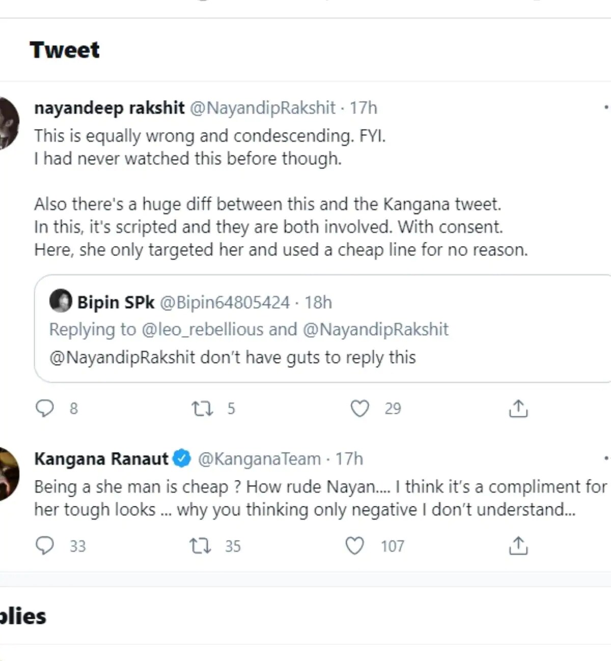 अखेर वाढत्या टीकेला रोखण्यासाठी कंगनानं देखील मग स्पष्टीकरण दिलं. शी-मॅन ही काही शिवी नाही. तुम्ही या शब्दाकडं नकारात्मक विचारानं का पाहता. उलट मी तापसीची स्तुतीच केली आहे. अशा आशयाचं ट्विट करुन कंगनानं स्पष्टीकरण दिलं. तिचं हे ट्विट सध्या सोशल मीडियावर सर्वांचेच लक्ष वेधून घेत आहे. यापूर्वी कंगना पाकिस्तानची स्तुती केल्यामुळं चर्चेत होती.
