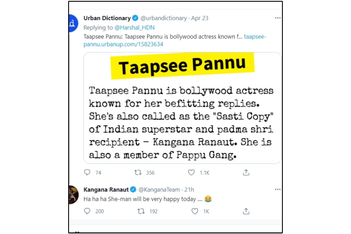 ‘सामान्य लोकांना देखील वेळ द्या’; सलमान खानच्या बॉडीगार्डला भेटणारे आरोग्यमंत्री झाले ट्रोल अर्बन डिक्शनरी या ट्विटर हँडलवरुन कंगनाचं एक जुनं ट्विट पोस्ट करण्यात आलं होतं. या ट्विटमध्ये कंगनानं तापसीवर टीका केली होती. दरम्यान या ट्विटला प्रतिक्रिया देताना कंगनानं तिला शी-मॅन असं म्हटलं. मात्र तिचं हे ट्विट पाहून काही नेटकरी संतापले. तू काय बोलतेस ते तुला तरी कळतं का? अशा प्रकारच्या प्रतिक्रिया देऊन स्वत:च्या इभ्रतीचे वाभाडे काढून घेत आहेस अशा आशयाच्या प्रतिक्रिया देत ट्रोलर्सनं तिच्याविरोधात संताप व्यक्त केला होता. अवश्य पाहा -