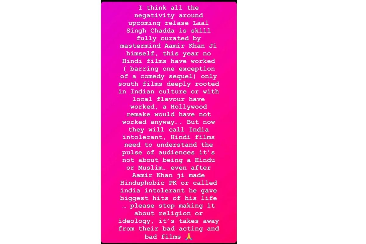 मुंबई, 3 ऑगस्ट : बॉलिवूड चित्रपट आणि अभिनेत्याचा वाद हे समीकरण खूप जुनं आहे. बॉलिवूडमध्येही दोन गट आहेत. हे कलाकार आपल्या अभिव्यक्ती स्वातंत्र्याचा पुरेपुर उपयोग करताना दिसतात. काही वेळा एखाद्या प्रसंगावर वक्तव्य करत हे कलाकार प्रेक्षकांचा रोष स्वतःवर ओढून घेतात आणि नवा वाद निर्माण होतो. आता प्रसिद्ध अभिनेता आमिर खानमुळे पुन्हा वाद निर्माण झाला आहे. आमिर खान तब्बल चार वर्षांनंतर ‘लाल सिंग चड्ढा’ चित्रपटातून मोठ्या पडद्यावर पुनरागमन करत आहे.अद्वैत चंदन दिग्दर्शित हा चित्रपट ११ ऑगस्ट २०२२ रोजी चित्रपटगृहात प्रदर्शित होणार आहे. सध्या आमिर या चित्रपटाच्या प्रमोशनमध्ये व्यग्र आहे. पण आता या चित्रपटामुळे नवीनच वाद निर्माण झाला आहे. सध्या सोशल मीडियावर ‘बॉयकॉट लाल सिंग चड्ढा’ हा ट्रेंड प्रचंड व्हायरल होत आहे. चित्रपट प्रदर्शित होण्यापूर्वीच हा ट्रेंड सुरू झाल्याने आमिर खानची चिंता वाढली आहे. त्याने ‘कृपया माझे चित्रपट बॉयकॉट करू नका’ अशी माध्यमांद्वारे विनंती केली होती. तेव्हापासून या चित्रपटाची प्रचंड चर्चा होतेय. पण आता अभिनेत्री कंगना रणौतने या वादात उडी घेत तिचे मत व्यक्त केले आहे. कंगना स्पष्टवक्ती आहे. तिचे मत ती बिनधास्तपणे मांडते. आताही तिने केलेल्या विधानाबद्दल नवीन चर्चा सुरू झाली आहे. कंगनाने तिच्या इन्स्टाग्राम अकाऊंटद्वारे एक पोस्ट शेअर केली आहे. या पोस्टमध्ये तिने ‘बॉयकॉट लाल सिंग चड्ढा’ यामागे आमिरच कारणीभूत असल्याचं म्हटलं आहे. हेही वाचा - Priyanka Chopra: अखेर प्रियांका चोप्रा ‘या’ दिवशी दाखवणार लेक मालतीचा चेहरा; आई मधुने केला खुलासा “आगामी हिंदी चित्रपट ‘लाल सिंग चड्ढा’बाबत सध्या नकारात्मक वातावरण निर्माण झालं आहे. पण यामागचा मास्टरमाइंड खुद्द आमिर खानच आहे. फक्त एक हिंदी विनोदी चित्रपट सोडला तर यावर्षी एकही हिंदी चित्रपट बॉक्स ऑफिसवर चालला नाही. भारतीय संस्कृतीशी जोडले गेलेल दाक्षिणात्य चित्रपटच उत्तम कामगिरी करत आहेत.” असं कंगना आपल्या पोस्टद्वारे स्पष्टपणे म्हणाली. पुढे कंगना म्हणाली, “हॉलिवूड चित्रपटाचा रिमेक असलेला हिंदी चित्रपट यशस्वी कामगिरी करत नाही. प्रेक्षकांना काय पाहायला आवडतं हे सर्वप्रथम हिंदी चित्रपटसृष्टीने समजून घेतलं पाहिजे.’’ यावेळी तिने ‘पीके’ चित्रपटाचा देखील उल्लेख केला आहे. आमिरच्या या चित्रपटात हिंदू देवतांचा अपमान केला होता. त्यालाच धरून कंगणाने आमिरला ‘तू तुझ्या करिअरमध्ये अनेक सुपरहिट चित्रपट केले. पण चित्रपटांना एखादा धर्म किंवा त्याच्या विचारधारांशी जोडणं बंद कर.’ असं सुनावलं आहे.