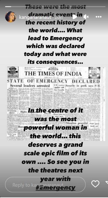 मुंबई, 26 जून : आपलं परखत मत मांडणारी आणि नेहमीच वादाच्या भोवऱ्यात सापडणारी अभिनेत्री म्हणजे कंगना रणौत(kangana ranaut). कंगना सतत कोणत्या ना कोणत्या विषयावर बोलत असते. कोणतंही क्षेत्र असो ती तिचं मत मांडायला अजिबात घाबरत नाही. आपल्या स्वभावामुळे ती नेहमीच ट्रोलरच्या निशाण्यावर असते. अशातच कंगनानं तिच्या आगामी चित्रपटाविषयी एक किस्सा सोशल मीडियावर शेअर केलाय. कंगना रणौत तिचा आगामी चित्रपट ‘एमरजेन्सी’ (Emergency movie))मध्ये इंदिरा गांधींची (Indira gandi )भूमिका साकारताना दिसणार आहे. कंगनानंच या चित्रपटाची निर्मिती आणि दिग्दर्शन केलं आहे. कंगनानं काल इन्स्टाग्रामवर (Kangana insta story) एक स्टोरी शेअर करत 1975 मधील आणीबाणीविषयी चित्रपटातील किस्सा सांगितलाय. जगाच्या अलीकडच्या इतिहासातील या सर्वात नाट्यमय घटना होत्या. आज कशामुळे आणीबाणी जाहीर करण्यात आली आणि त्याचे काय परिणाम झाले. जगातील सर्वात शक्तिशाली स्त्री केंद्रस्थानी होती. ती स्वतःच एका भव्य चित्रपटाला पात्र आहे. त्यामुळे पुढच्या वर्षी एमरजेन्सीसह चित्रपटगृहांमध्ये भेटू. हेही वाचा -