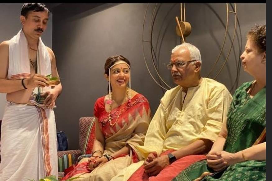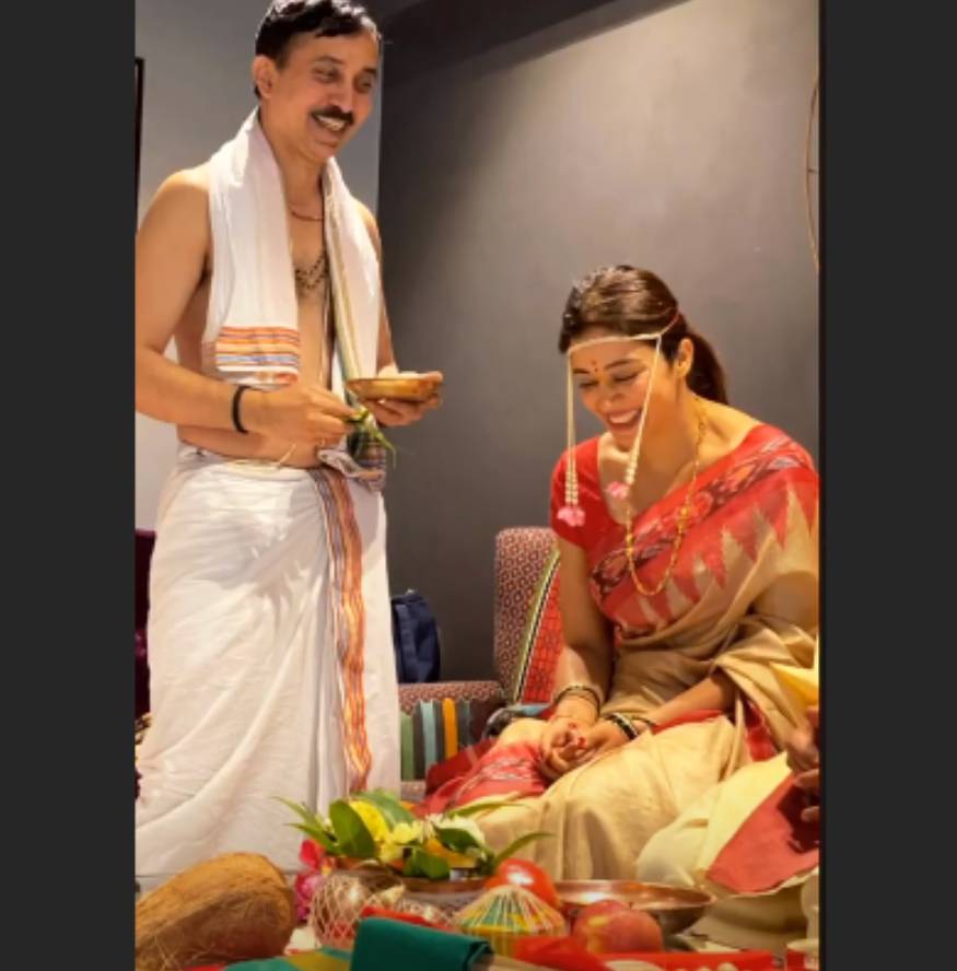 दुसऱ्या एका फोटोमध्ये गुरुजींनी सांगितल्याप्रमाणं पूजा करताना दिसत आहे. यावेळी तिच्या चेहऱ्यावरचा आनंद ती खूप खूश असल्याचं सांगून जात आहे.