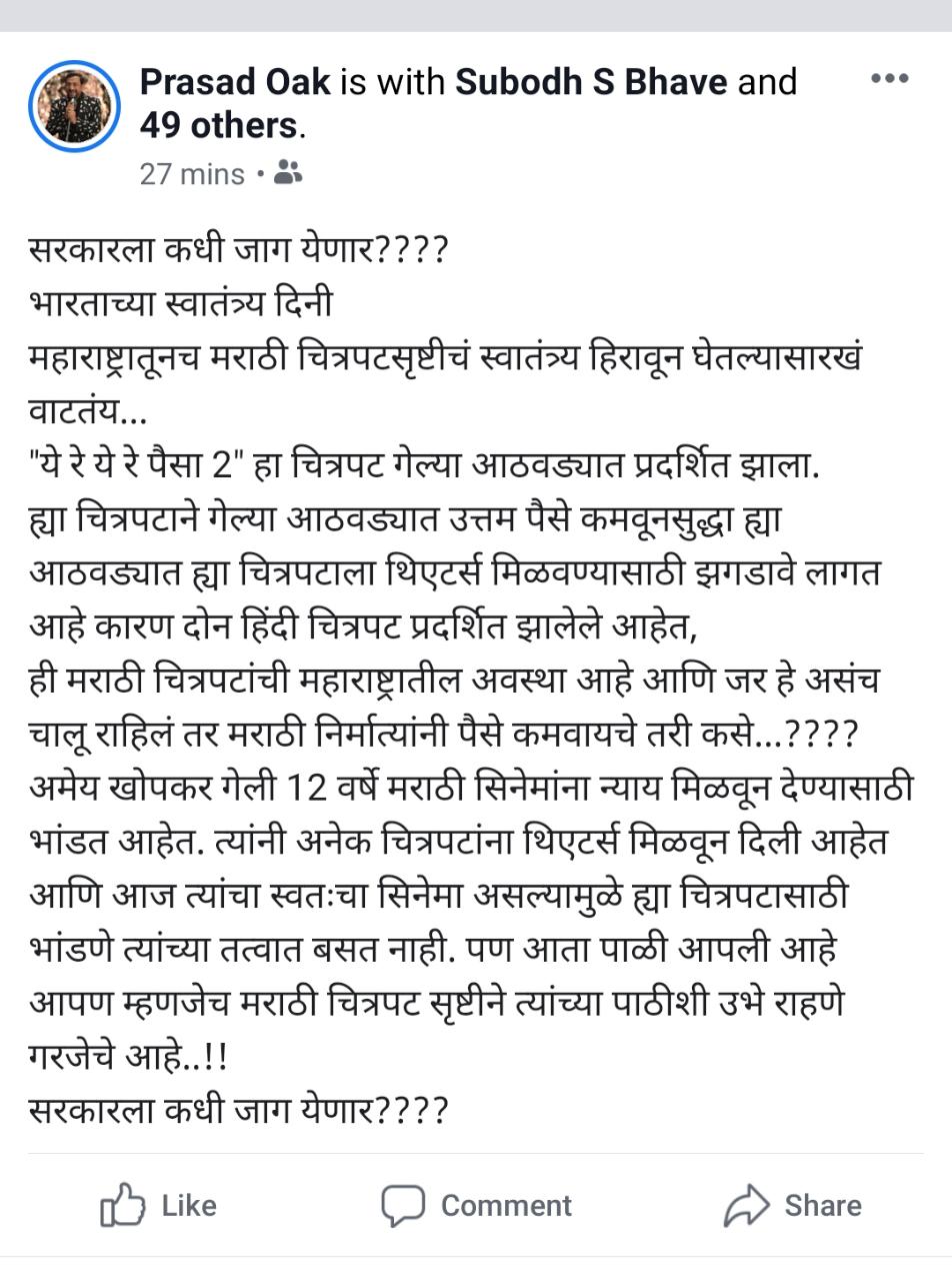 प्रसादनं त्याच्या पोस्टमध्ये लिहिलं, ‘सरकारला कधी जाग येणार??? भारताच्या स्वातंत्र्य दिनी महाराष्ट्रातूनचं मराठी चित्रपटसृष्टीचं स्वातंत्र्य हिरावून घेतल्यासारखं वाटतंय… ‘ये रे ये रे पैसा2’ हा सिनेमा गेल्या आठवड्यात रिलीज झाला. या सिनमानं चांगली कमाई करूनही या आठवड्यात या सिनेमाला थिएटर्ससाठी झगडावं लागत आहे. कारण दोन हिंदी सिनेमा या आठवड्यात रिलीज झाले आहेत. ही मराठी सिनेमांची महाराष्ट्रातील अवस्था आहे आणि जर हे असचं चालू राहिलं तर मराठी निर्मात्यांनी पैसे कमवायचे तरी कसे. अमेय खोपकर मागच्या 12 वर्षांपासून मराठी सिनेमांना न्याय मिळवून देण्यासाठी झटत आहेत. त्यांनी अनेक सिनेमांना थिएटर्स मिळवून दिले आहेत. मात्र आता त्यांचा स्वतःचा हा सिनेमा असल्यानं त्यासाठी भांडणं त्यांच्या तत्त्वात बसत नाही. पण आता वेळ आली आहे. आपण म्हणजे मराठी सिनेसृष्टीनं त्यांच्या पाठीशी खंबीरपणे उभं राहणं गरजेचं आहे.’