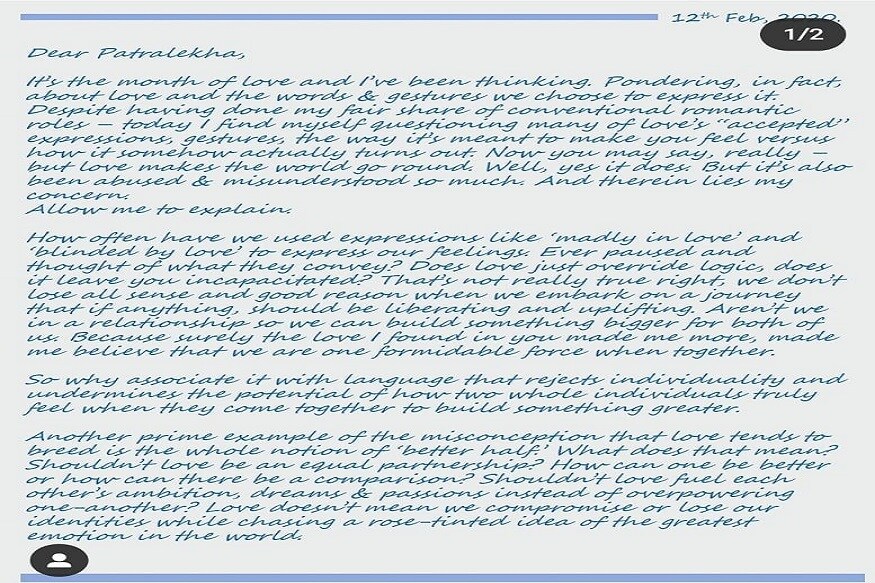 मुंबई, 13 फेब्रुवारी - व्हॅलेंटाईन डे (Valentine Day) आता फक्त एका दिवसावर येऊन ठेपलाय. अशातचं सर्व प्रेमी युगुलं आपल्या साथीदाराला सरप्राईज देण्याच्या तयारीत आहेत. आपल्या वॅलेंटाईव डे ला खास बनवण्यासाठी बॉलिवूडचे सुपरस्टारही आता सोशल मीडियावर अॅक्टिव झालेत. आपलं प्रेम व्यक्त करण्यासाठी अभिनेता राजकुमार राव (Rajkummar Rao) यानं आपली गलफ्रेंड पत्रलेखाला इंस्टाग्रामवर दोन पानांचं लव्हलेटर लिहिलंय. हे लव्हलेटर Instagram वर पोस्ट केल्यानंतर ते लगेच व्हायरल झालं. त्याच्या या लेटरला एक लाखांपेक्षाही जास्त लाईक्स मिळाले आहेत. राजकुमार रावने असं केलं प्रेम व्यक्त - ‘डियर पत्रलेखा, हा प्रेमाचा महिना आहे आणि मी याच्या बाबतीतच विचार करत होतो. त्या शब्द आणि इशाऱ्यांबाबत मी विचार करत होतो ज्याद्वारे आपण आपलं प्रेम व्यक्त करतो. मी अनेक रोमॅंटीक आणि चांगले रोल्स केल्यानंतरही माझ्या मनात प्रेमाचा स्विकार करण्याबाबत अनेक प्रश्न उपस्थित होत आहेत. असं बरंच काही लिहित राजकुमार रावने पुढे म्हलंय की, किती तरी वेळा असं होतं की प्रेमात वेडा होणं आणि प्रेमात आंधळं होणं असे शब्द आपण वापरून जातो कारण आपल्या भावना आपल्या प्रिय व्यक्तीला कळाव्यात म्हणून कधी कुणी याचा विचार केला असेल का की याचा अर्थ काय आहे? खरंच प्रेम हे आहे की याचा काही तर्क नाही. त्याच्या या दोन पानांच्या लव्हलेटरने त्याच्या गर्लफ्रेंडसोबतच त्याच्या चाहत्यांचंही मन जिंकलं आहे. काही चाहत्यांनी तर त्यावर कमेंटही केल्या आहेत. एकानं तर लिहिलं आहे की, हे खूपच प्रेमळ लव्हलेटर आहे. तर दुसऱ्यानं लिहिलंय की, या थंडीच्या दिवसांमध्ये गरम गरम कॉफीसारखं आहे हे लव्ह लेटर. सोशल मीडियावर राजकुमार रावचा हा प्रेम व्यक्त करण्याचा त्याचा हा अंदाज सगळ्यांच्याच पसंतीला अतरला आहे.