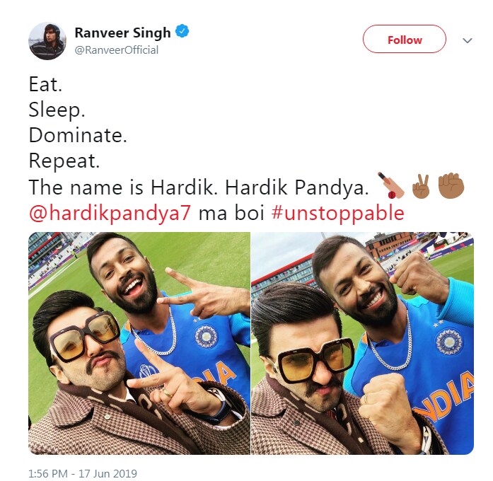 रणवीरने एकीकडे सौरव गांगुली आणि सचिन तेंडुलकरसोबत फोटो शेअर केले तर हार्दिक पांड्यासोबतही फोटो शेअर करत त्याला भन्नाट कॅप्शन दिली. पांड्याच्या फोटोला कॅप्शन देताना त्याने लिहिले की, ‘Eat. Sleep. Dominate. Repeat. The name is Hardik. Hardik Pandya. @hardikpandya7 ma boi #unstoppable’. रणवीरच्या या कॅप्शनवर WWE चा प्रसिद्ध रेसलर ब्रोक लेन्सरचा वकील पॉल हेमैन नाराज झाला आणि रागात त्याने ट्विटरवरच रणवीरची शाळा घेतली.