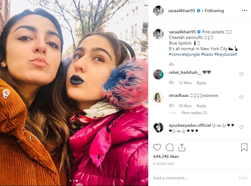 मुंबई, 22 नोव्हेंबर : अभिनेत्री सारा अली खान नेहमीच काही ना काही कारणानं चर्चेत असतात. पदार्पणातच दोन्ही सिनेमा सुपरहीट देणारी सारा मागच्या काही काळापासून तिचा आगामी सिनेमा ‘कुली नंबर 1’च्या शूटिंगमध्ये बीझी होती. मात्र आता या सिनेमाचं शूटिंग संपलं असून सारा अली खान न्यूयॉर्क सिटीमध्ये तिची सुट्टी एंजॉय करत आहे. सारानं तिच्या इन्स्टाग्रामवर काही फोटो शेअर केले आहेत. ज्यामध्ये ती न्यूयॉर्कमध्ये धम्माल करताना दिसत आहे. पण यातील साराचा एक फोटो सोशल मीडियावर चर्चेचा विषय ठरत आहे. सारा अली खान सुट्टी एंजॉय करतानाच तिच्या चाहत्यांना फॅशन टीप्स देताना दिसत आहे. तिनं तिच्या इन्स्टाग्राम नुकताच एक फोटो शेअर केला आहे. ज्यात तिनं गडद काळ्या-निळ्या रंगाची लिपस्टिक लावलेली दिसत आहे. हा फोटो शेअर करताना सारानं लिहिलं, ‘अशी गडद लिपस्टिक लावणं न्यूयॉर्क सिटीमध्ये खूपच सामान्य बाब आहे.’ साराच्या या फोटोवर युजर्सच्या वेगवेगळ्या प्रतिक्रिया येताना दिसत आहेत. पण विशेष म्हणजे साराच्या अवतारावरुन तिला कोणीही ट्रोल मात्र केलेलं दिसत नाही. पण एक मिनिटासाठी कोणीतरी आवरा हिला असा विचार मनात आल्याशिवाय राहत नाही.