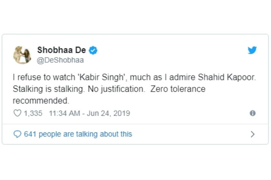 मुंबई, जून 26 : शाहिद कपूरचा ‘कबीर सिंग’ चित्रपट सध्या चांगलाच चर्चेत आहे. एकीकडे तेलगू चित्रपट ‘अर्जुन रेड्डी’चा हा अधिकृत रिमेक असला तरी प्रेक्षकांकडून चित्रपटाला चांगला प्रतिसाद मिळतोय. तर दुसरीकडे मात्र चित्रपटावर टीकेची झोड उठवली जातेय. 21 जूनला प्रदर्शित झालेला हा सिनेमा बॉक्स ऑफिसवर रेकॉर्ड ब्रेक कमाई करत आहे. संजय लीला भन्साळी यांच्या ‘पद्मावत’ चित्रपटाला मागे टाकत या चित्रपटाने 100 कोटींचा पल्ला गाठला आहे. याशिवाय शाहिद कपूर आणि कियारा आडवाणी यांच्या अभिनयाचं कौतुकही होतंय. असं असलं तरी, या चित्रपटाला विरोध करणाऱ्यांची संख्याही काही कमी नाही. कबीर सिंगमध्ये चाकूची भीती दाखवत मुलीला कपडे उतरवायला सांगतात असा एक सीन दाखविण्यात आला आहे. नेमकी याच दृश्यावर समीक्षकांसह प्रेक्षकांनाही आक्षेप घेतला आहे. यात आणखी भर पडली ती शोभा डे यांच्या ट्वीटने. आपलं मत परखड आणि निर्भीडपणे मांडणाऱ्या लेखिका आणि पत्रकार शोभा डे यांनी चित्रपटाविरोधात कडक भूमिका घेतली आहे. त्यांनी कबीर सिंग चित्रपट पाहण्यासाठी विरोध दर्शवला आहे. याबद्दल ट्वीट करताना त्या म्हणाल्या की, ‘मी शाहिदची खूप मोठी फॅन आहे पण, कबीर सिंग हा चित्रपट पाहण्यासाठी नकार देते.‘स्टॉकिंग’ हा गुन्हा आहे. त्याला कोणत्याही प्रकारे सहन केले जाणार नाही.’