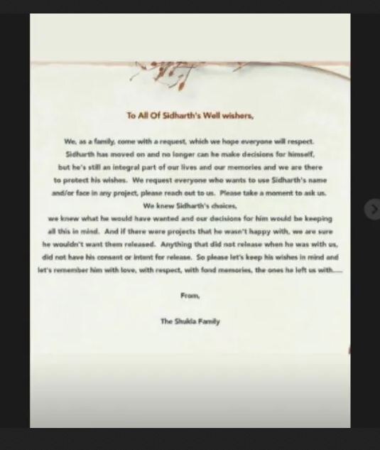 मुंबई, 26 जानेवारी- प्रसिद्ध टीव्ही अभिनेता आणि बिग बॉस विजेता (Bigg Boss Winner) सिद्धार्थ शुक्लाच्या निधनाला (Sidharth Shukla Death) तब्बल चार महिने होत आले आहेत.परंतु आजही चाहते त्याला विसरू शकलेले नाहीत. आजही सोशल मीडियावर विविध पोस्ट शेअर करून अभिनेत्याची आठवण काढली जाते. दरम्यान आता शुक्ला कुटुंबाकडून एक निवेदन जारी करण्यात आलं आहे. यामध्ये त्यांनी एक खास आवाहन केलं आहे. हे निवेदन शेहनाज गिलने (Shehnaaz Gil) आपल्या इन्स्टाग्रामवर (Instagram) शेअर केलं आहे. काय आहे निवेदन- दिवंगत अभिनेता सिद्धार्थ शुक्लाच्या कुटुंबाने नुकताच एक निवेदन जारी केलं आहे. या निवेदनात असं सांगण्यात आलं आहे. की, आगामी काळात कोणत्याही प्रोजेक्टमध्ये सिद्धार्थ शुक्लाच्या नावाचा वापर करण्यात येणार असेल, तर त्याआधी त्याच्या कुटुंबाशी संपर्क साधण्यात यावा. तसेच निवेदनात पुढे म्हटलं आहे, ‘सिद्धार्थच्या सर्व शुभचिंतकांना त्याच्या या कुटुंबामार्फत आम्ही आवाहन करत आहे. आता सिद्धार्थ या जगात नाही. तो आता पुढे निघून गेला आहे. त्यामुळे तो याठिकाणी आता कोणतेही निर्णय घेऊ शकत नाही. परंतु तो आजही आमच्यामध्ये जिवंत आहे. त्यामुळे आम्ही त्याच्या इच्छा आणि सूत्रांचं पालन याठिकाणी करत आहोत’. सर्वांनीच त्याचा आदर करावा आणि सहकार्य करावं. यामध्ये सांगण्यात आलं आहे, इथून पुढे कोणत्याही प्रोजेक्टमध्ये सिद्धार्थच्या नावाचा किंवा त्याच्या चेहऱ्याचा वापर करण्यात येणार असेल, तर सर्वात आधी आमच्या कुटुंबाशी संपर्क साधण्यात यावा. कारण आम्ही त्याच्या इच्छा आणि आवडी निवडी चांगल्या प्रकारे ओळखतो. आम्हाला चांगलंच माहिती आहे त्याच्या उपस्थित तो कोणत्या गोष्टीला मान्यता दिला असता आणि कोणत्या नाही. त्यामुळे त्याचा आदर करूनच पुढचे सर्व निर्णय घेतले जातील. अपेक्षा आहे की सर्वांनीच या गोष्टीचं पालन करावं. शेहनाज गिलची पोस्ट- अभिनेत्री शेहनाज गिलने शुक्ला कुटुंबामार्फत जारी करण्यात आलेलं हे निवेदन आपल्या सोशल मीडियावर शेअर केलं आहे. शेहनाजने काही तासांपूर्वी आपल्या इंस्टाग्राम स्टोरीवर हे निवेदन शेअर केलं आहे. शेहनाज सिद्धार्थच्या अत्यंत जवळ होती. या दोघांचं नातं त्यांचं प्रेम सर्वांनीच पाहिलं आहे. बिग बॉसच्या घरात शेहनाज आणि सिद्धार्थमध्ये एक खास नातं तयार झालं होतं. हे दोघेही घरात एकमेकांसाठी उभे राहताना दिसले होते. परंतु सिद्धार्थच्या अचानक जाण्याने शेहनाजला मोठा धक्का बसला होता. सध्या यामधून स्वतःला सावरत आहे.