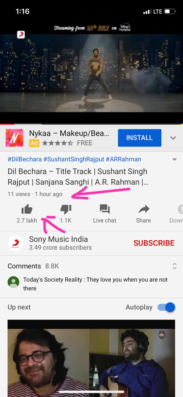 मुंबई, 10 जुलै : सुशांत सिंह राजपूतचा शेवटचा चित्रपट ‘दिल बेचारा’चे टायटल ट्रॅक आज प्रदर्शित झाले आहे. दरम्यान हे गाणे प्रदर्शित होऊन एका तासाने युट्यूबवर या गाण्याला केवळ 11 Views दिसत होते. त्यामुळे आश्चर्य व्यक्त करण्यात आले. कारण या गाण्यावर 2.7 लाख लाइक्स आहेत. दोन्ही आकड्यांमध्ये एवढी मोठी तफावत असल्याने आश्चर्य व्यक्त केले गेले. यामध्ये काहीतरी तांत्रिक गडबड झाल्याचा अंदाज वर्तवण्यात आला. मात्र याबाबत चित्रपटाचे दिग्दर्शक किंवा फॉक्स स्टार (Fox Star) कडून अद्याप कोणतीही अधिकृत प्रतिक्रिया आली नाही आहे. काही वेळाने या व्हिडीओवर 4.9 लाखापेक्षा जास्त views दिसू लागले आहेत. ‘दिल बेचारा’ चित्रपटाचा ट्रेलर 06 जुलै रोजी प्रदर्शित झाला आणि या ट्रेलरने लाखो views मिळवले होते. दरम्यान आज सुशांतच्या या शेवटच्या चित्रपटातील गाणं आज प्रदर्शित झाले आहे. ‘दिल बेचारा’ या सिनेमाचे ते टायटल ट्रॅक आहे. या गाण्याला काही तासातच कमालीचा रिस्पॉन्स त्याच्या चाहत्यांकडून मिळत आहे. सोशल मीडियाच्या विविध प्लॅटफॉर्मवर देखील हे गाणे शेअर करण्यात आले आहे.