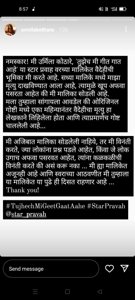 मुंबई,4 जून- अवघ्या काही दिवसांपूर्वी ‘तुझेच मी गीत गात आहे’ (Tujhech Mi Geet Gaat Ahe) ही मालिका प्रेक्षकांच्या भेटीला आली आहे. या मालिकेने अल्पावधीतच प्रेक्षकांचं मन जिंकलं आहे. मालिकेला प्रचंड लोकप्रियता मिळत आहे. त्यामुळेच मालिका टीआरपी रेसमध्ये टॉप 10 च्या यादीत समाविष्ट झाली आहे. दरम्यान मालिकेतून मुख्य अभिनेत्री असणाऱ्या उर्मिला कोठारेने (Urmila Kothare) ही मालिका सोडल्याची चर्चा सुरु आहे. या सर्व चर्चांवर आता पूर्णविराम देत उर्मिलाने सत्य समोर आणलं आहे. पाहूया अभिनेत्री नेमकं काय म्हणाली. उर्मिलाने नुकतंच आपल्या इन्स्टाग्रामवर आपली एक पोस्ट शेअर केली आहे. यामध्ये खुलासा करत तिने लिहिलंय, ‘‘नमस्कार मी उर्मिला कोठारे, स्टार प्रवाह वरच्या मालिकेत मी वैदेहीची भूमिका करत आहे. सध्या मालिकेत माझा मृत्यू दाखविण्यात आला आहे. त्यामुळे खूप अफवा पसरत आहेत की,, मी मालिका सोडली आहे. परंतु मला तुम्हाला सांगायला आवडेल की ओरिजिनल स्टोरीमध्ये लेखकाने एक महिन्यानंतर वैदेही चा मृत्यू लिहिला आहे. त्यामुळे स्टोरी तशीच सुरु आहे’. ‘मी अजिबात मालिका सोडलेली नाहीय. त्यामुळे मी विनंती करते, ज्या लोकांना हा प्रश्न पडला आहे. किंवा ज्या लोकांनी अशा अफवा पसरविल्या आहेत. त्यांना माझी कळकळीची विनंती आहे की असं कृपया करू नका. मी या मालिकेत अजूनही आहे. आणि मी स्वराच्या आठवणीत कायम मालिकेत दिसत राहणार आहे. त्यामुळे मी ही मालिका सोडलेली नाही. (हे वाचा: