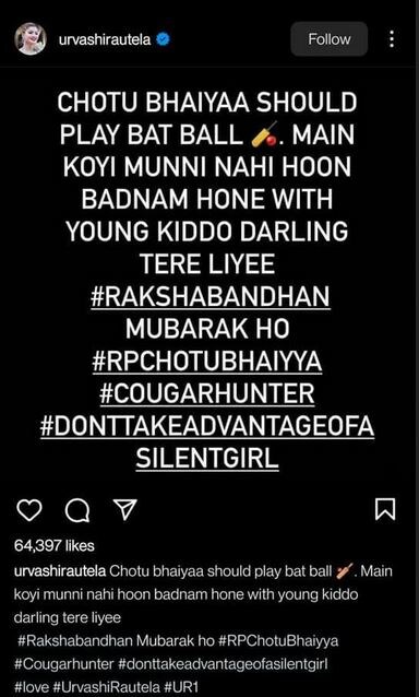 मुंबई, 12 ऑगस्ट- बॉलिवूड अभिनेत्री उर्वशी रौतेला आणि क्रिकेटर ऋषभ पंत यांच्यातील वाद थांबण्याचं नाव घेत नाहीये. उर्वशीने काही दिवसांपूर्वी एका मुलाखतीत दावा केला होता की ‘आरपी’ नावाची व्यक्ती एकदा हॉटेलच्या लॉबीमध्ये अनेक तास तिची वाट पाहात होती. यानंतर ऋषभने सोशल मीडियावर अभिनेत्रीची खिल्ली उडवत एक पोस्ट शेअर केली होती. नंतर काही वेळातच त्याने ही पोस्ट डिलीटदेखील केली होती. परंतु आता अभिनेत्रीनेसुद्धा उत्तर देत एक नवी पोस्ट शेअर केली आहे. उर्वशी रौतेला आणि ऋषभ पंत यांचा वाद फारच जुना आहे. हे दोघेही सतत एकमेकांना टोमणे देत असतात. मीडिया रिपोर्ट्सनुसार, अभिनेत्रीने एकदा सांगितलं होतं की, ती क्रिकेटरला डेट करत आहे. ऋषभने ही गोष्ट फेटाळून लावली होती. त्यांनतर लगेचच त्याने अभिनेत्रीला सोशल मीडियावर ब्लॉक केलं होतं. ऋषभ आणि उर्वशी मुंबईत एकेठिकाणी एकत्र दिसून आले होते त्यांनतर त्यांच्या अफेयर्सच्या चर्चांना उधाण आलं होतं. उर्वशी रौतेला पोस्ट- ऋषभ पंतच्या पोस्टवर उत्तर देत उर्वशी रौतेलाने लिहलंय, ‘‘छोटू भैय्याने बॅट-बॉल खेळायला हवं. मी कोणतीही मुन्नी नाहीय, बदनाम व्हायला. यंग किड्डो डार्लिंग्स तुला रक्षाबंधनाच्या हार्दिक शुभेच्छा’. असं म्हणत उर्वशीने ऋषभची फिरकी घेतली आहे. शिवाय अभिनेत्रीने अनेक हॅशटॅगसुद्धा वापरले आहेत. या दोन्ही सेलेब्रेटींमधील वाद वाढतच चालला आहे. सध्या सोशल मीडियावर या दोघांच्या चांगल्याच चर्चा सुरु आहेत. कुणी उर्वशीला स्पोर्ट करत आहेत तर कुणी ऋषभला स्पोर्ट करताना दिसून येत आहे. नेमकं काय घडलं होतं?- उर्वशीने बॉलिवूड हंगामाला दिलेल्या मुलाखतीत आपली कुणीतरी रात्रभर वाट पाहिल्याचं सांगितलं होतं. ती म्हणाली, ‘मी नवी दिल्लीत शूटिंग करत होते आणि रात्री पोहोचले. मला पटकन तयार व्हावं लागलं कारण अभिनेत्रींना तयार होण्यासाठी जास्त वेळ लागतो.