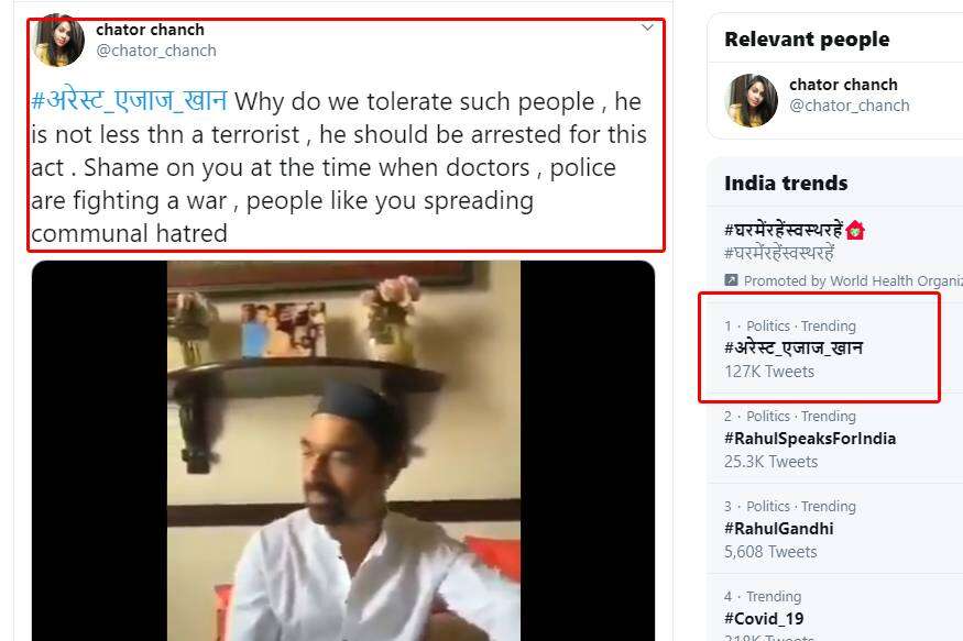 एजाज खाननं 15 एप्रिलला रात्री 12.30 ला फेसबुक लाइव्ह केलं होतं. यावेळी तो या विषयावर बोलला आहे. या लाइव्ह व्हिडीओमध्ये एजाज खान म्हणाला, मुंगी मेली मुस्लीम जबाबदार, हत्ती मेला मुस्लीम जबाबदार, दिल्लीत भूकंप झाला मुस्लीम जबाबदार म्हणजे देशातल्या प्रत्येक गोष्टीसाठी मुस्लीमांना जबाबदार ठरवलं जातं. मात्र हा बनाव रचला जात आहे. याचा विचार तुम्ही कधी केला आहे का? हा व्हिडीओमध्ये एजाज खाननं या सर्व गोष्टींसाठी एका राजकीय पार्टीला जबाबदार ठरवलं आहे.