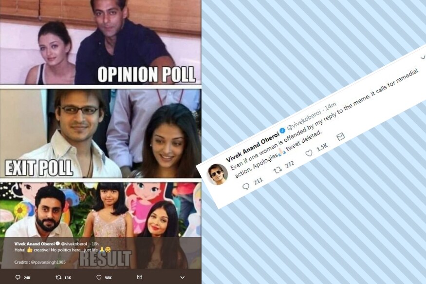 लग्नानंतर एकटीच हनिमूनला गेली होती ‘या’ अभिनेत्याची पत्नी दरम्यान, विवेकने दुसऱ्या एका युझरचं मीम ट्विटरवर शेअर केलं होतं. या मीममध्ये विवेक स्वतः असून ऐश्वर्या राय, सलमान खान आणि अभिषेक बच्चनही दिसत होते. विवेकने हे मीम शेअर करत फक्त एग्झिट पोलचीच थट्टा उडवली नाही तर ऐश्वर्या रायचीही थट्टा उडवली होती. विवेकने शेअर केलेल्या मीममधील पहिल्या फोटोत सलमान आणि ऐश्वर्या दिसत होते. या फोटोला कॅप्शन दिलं गेलंय की, ओपिनियन पोल. दुसऱ्या फोटोमध्ये विवेक आणि ऐश्वर्या दिसत होते. या फोटोवर लिहिलं गेलं की, एग्झिट पोल. तर तिसऱ्या फोटोमध्ये ऐश्वर्या अभिषेक बच्चन आणि मुलगी आराध्यासोबत दिसत होते. या फोटोला कॅप्शन लिहिलं गेलं की ‘रिझल्ट’. SPECIAL REPORT: एक्झिट पोलनंतर सोशल मीडियावर मीम्सला उधाण