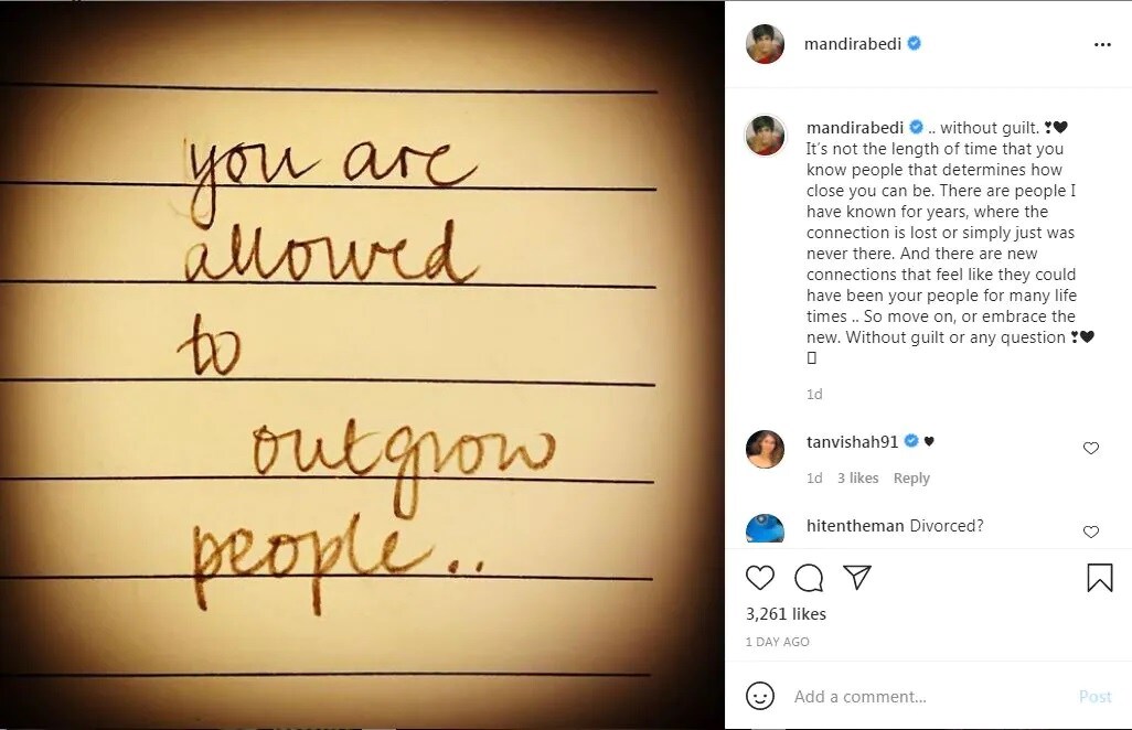 मंदिराच्या या पोस्टवर अनेकांनी प्रश्न उपस्थित केले आहेत. व राज आणि मंदिरा यांच्यात सगळं काही अलबेल तर होत ना असेही प्रश्न उपस्थित केले जात आहेत. काहींनी तर ‘घटस्फोट का?’ असा प्रश्नही विचारला.