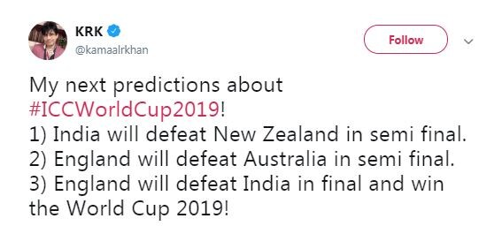 मुंबई, 09 जुलै- Ind vs Nz: देशभरात आज फक्त वर्ल्ड कप 2019 च्या उपांत्य फेरीतील भारत विरुद्ध न्युझीलंड सामन्याचीच चर्चा आहे. एकीकडे क्रिकेट चाहत्यांमध्ये सामन्याचा उत्साह दिसत आहे तर दुसरीकडे बॉलिवूड अभिनेता कमाल आर खानने आज सामना आणि वर्ल्ड कपमध्ये कोण जिंकेल याबद्दल ट्वीट केलं आहे. त्याचं हे ट्वीट मोठ्या प्रमाणात व्हायरल होत आहे. मंगळवारी भारतविरुद्ध न्युझीलंड यांच्या सामन्याबद्दल कमाल आर खानने ट्वीट करत म्हटलं की, हा सामना कोहली सेनाच जिंकेल. तसेच त्याने भविष्यवाणी करत पुढे लिहिलं की, उपांत्य फेरीतील सामना टीम इंडिया जिंकून न्युझीलंडला हरवेल आणि ऑस्ट्रेलियाला हरवून इंग्लंड अंतिम सामन्यात जाईल. यानंतर भारत आणि इंग्लंडमध्ये वर्ल्ड कपचा अंतिम सामना रंगेल, ज्यात इंग्लंडचा ऐतिहासिक विजय होईल आणि भारताचा पराभव होईल. बॉलिवूडमधील देशद्रोही या सिनेमात केआरकेने काम केलं होतं. यानंतर तो सलमान खानच्या बिग बॉस सीझन ३ मध्ये दिसला होता. या शोमध्ये तो अनेक वादांमध्ये अडकला होता. आताही सोशल मीडियावर वादग्रस्त ट्वीट करण्यासाठी तो ओळखला जातो. वर्ल्ड कपशी निगडीत या भविष्यवाणीसाठीही त्याला जबरदस्त ट्रोल केलं जात आहे.