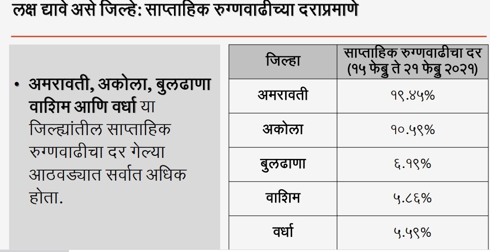 अमरावती, अकोला, बुलढाणा, वाशिम आणि वर्धा जिल्ह्यांमध्ये गेल्या आठवड्यात सर्वाधिक रुग्णवाढ झाली. 15 फेब्रुवारी ते 22 फेब्रुवारी या काळात विदर्भातल्या या जिल्ह्यांमध्ये कोरोनाचा कहर झाल्याचं या आकडेवारीवरून स्पष्ट होईल. राज्य सरकारने लक्ष द्यावे अशा जिल्ह्यांच्या यादीत या पाच जिल्ह्यांचा समावेश केला आहे. 8807 रुग्ण, 80 मृत्यू; 2021 मधली महाराष्ट्राची कोरोनाची धक्कादायक आकडेवारी चाचण्यांच्या प्रमाणात पॉझिटिव्ह रिपोर्ट येण्याचं प्रमाणही विदर्भात अधिक आहे. गेल्या आठवड्यात झालेल्या कोरोना चाचण्यांपैकी अमरावतीत 41.58 जणांना कोरोना झाल्याचं स्पष्ट झालं. हा पॉझिटिव्हिटी रेट हादरवणारा आहे. त्या खालोखाल अकोला जिल्ह्यात 30.86 टक्के पॉझिटिव्हिटी रेट दिसून आला.