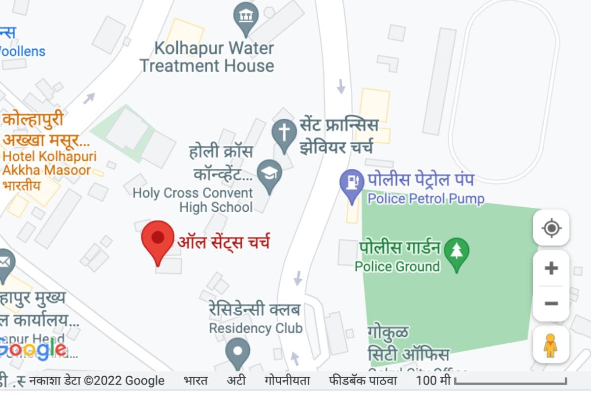 कुठे आहे चर्चा? ऑल सेंट्स चर्च, रेसिडेन्सी क्लब शेजारी, मुख्य पोस्ट ऑफिस, वारणा कॉलोनी, कोल्हापूर