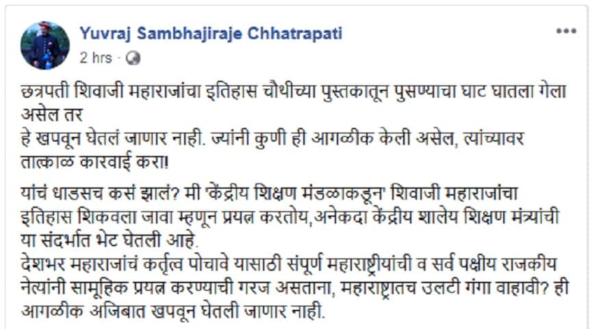 मुंबई, 17 ऑक्टोबर : छत्रपती शिवाजी महाराजांचा इतिहास प्राथमिक शाळेच्या अभ्यासक्रमातून शिकवण्यात येतो. जवळपास अर्ध्या शतकाहून अधिक वर्षांपासून शिवरायांचे धडे चौथीच्या अभ्यासक्रमातून शिकवले जात आहेत. याआधी शिवाजी महाराजांच्या इतिहासाला केंद्रीय शिक्षण मंडळाकडून पुरेसं स्थान देत नसल्याबद्दल राज्यभरातून नाराजी व्यक्त केली जात होती. दरम्यान आता आंतरराष्ट्रीय शिक्षण मंडळानेही केंद्रीय शिक्षण मंडळाच्या पावलावर पाऊल टाकलं आहे. राज्यात सध्या निवडणुकीची रणधुमाळी सुरू आहे. यात मतांच्या राजकारणासाठी शिवाजी महाराजांचे नाव प्रत्येक व्यासपीठावर घेतलं जात आहे. पण महाराष्ट्र आंतरराष्ट्रीय शिक्षण मंडळाने चौथीच्या पुस्तकातून शिवाजी महाराजांचा इतिहासच वगळला आहे. राज्यातील सरकारी शाळांमध्ये शिकत असलेल्या विद्यार्थांना स्थानिक संस्कृतीसह आंतरराष्ट्रीय स्तरावरील शिक्षण मिळावे यासाठी स्थानिक भाषेत शिक्षण देणाऱ्या शाळांना आंतरराष्ट्रीय असं बिरुद लावलं आहे. त्यासाठी महाराष्ट्र राज्य आंतरराष्ट्रीय शिक्षण मंडळ स्थापन करण्यात आलं. स्थापनेनंतर वर्षभर पुस्तकांशिवाय या शाळा चालवण्यात आल्या. या शाळेची पहिली ते चौथीची पुस्तके ऑगस्टमध्ये छापली गेली. त्यानंतर चौथीच्या पुस्तकात शिवरायांचा इतिहासच वगळल्याचं समोर आलं आहे. चौथीच्या अभ्यासक्रमात असलेल्या इतिहासाच्या पुस्तकात 1991 मध्ये बदल करण्यात आला होता. तेव्हा मोठा वाद झाल्यानंतर शिवाजी महाराजांचा चौथीच्या पुस्तकातील इतिहास न बदलण्याचा ठराव विधिमंडळात झाला होता. त्यानंतर 2010 मध्ये अभ्यासक्रमाची पुनर्रचनाही झाली मात्र चौथीचं इतिहासाचं पुस्तक तसंच ठेवण्यात आलं. 1970 मध्ये इतिहासाचा अभ्यासक्रम निश्चित करण्यात आला होता. त्यानंतर काही ठराविक बदल वगळले तर पुस्तक तसेच ठेवण्यात आलं आहे. पण आंतरराष्ट्रीय शिक्षण मंडळानं मात्र यात बदल केले आहेत. आंतरराष्ट्रीय शिक्षण मंडळाच्या अभ्यासक्रमातून शिवरायांचा इतिहास हद्दपार करणाऱ्या भाजप-शिवसेना सरकारला हद्दपार करण्याची हीच वेळ असल्याचं काँग्रेसचे खासदार अशोक चव्हाण यांनी म्हटलं आहे. तर खासदार छत्रपती संभाजी महाराज यांनीही संताप व्यक्त केला असून शिवाजी महाराजांचा इतिहास पुसण्याचा घाट घातला असेल तर हे खपवून घेतलं जाणार नाही असं म्हटलं आहे. तसेच ज्यांनी कुणी ही आगळीक केली असेल त्यांच्यावर तात्काळ कारवाई व्हावी अशी मागणी संभाजीराजेंनी केली आहे. VIDEO : ‘… म्हणून शरद पवारांना ईडीची नोटीस’, मुख्यमंत्री फडणवीस यांचा गौप्यस्फोट