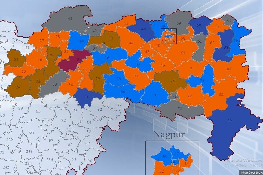 विदर्भ - 2014 परिस्थिती एकूण जागा - 62 भाजप - 44 शिवसेना - 4 काँग्रेस - 10 राष्ट्रवादी - 1 इतर - 3 2014 ची विधानसभेची परिस्थिती मागील विधानसभा निवडणुकीत महाराष्ट्रातील सर्वच राजकीय पक्षांनी स्वबळावर निवडणूक लढवली होती. भाजप-शिवसेनेची 25 वर्षांची युती तुटली आणि आघाडीनेही काडीमोड घेतला. या निवडणुकीत सत्ताधारी काँग्रेस-राष्ट्रवादी आघाडीचा धुव्वा उडवत भाजप क्रमांक एकचा पक्ष ठरला होता. शिवसेनेला 63 जागांवर समाधान मानावं लागलं होतं. एकूण जागा - 288 भाजप - 122 शिवसेना - 63 काँग्रेस - 42 राष्ट्रवादी - 41 गेल्या निवडणुकीत काँग्रेस-राष्ट्रवादीला अँटी एन्क्मबन्सीचा सामना करावा लागला होता. या वेळी हा फॅक्टर फडणवीस सरकारसाठी किती महत्त्वाचा ठरतो हे कळेल. राज्यात 15 वर्षांपासून असलेली सत्ता आघाडीने गमावल्यानंतर भाजप-सेना युतीचं सरकार आलं होतं. गेल्या निवडणुकीत कोणत्याही एका पक्षाला स्पष्ट बहुमतासाठी आवश्यक असलेला 145 जागांचा जादुई आकडा गाठता आला नाही. त्यामुळे नंतर भाजप-शिवसेनेनं पुन्हा एकत्र येत युतीचे सरकार स्थापन केलं. या वर्षी निवडणुकीपूर्वीच युती आणि आघाडी झाल्याने कुठल्याच पक्षाने सर्वच्या सर्व जागा लढवल्या नाहीत. सर्वाधिक जागा लढवणारा पक्ष आश्चर्यकारकरीत्या बहुजन समाज पार्टी हा राहिला.