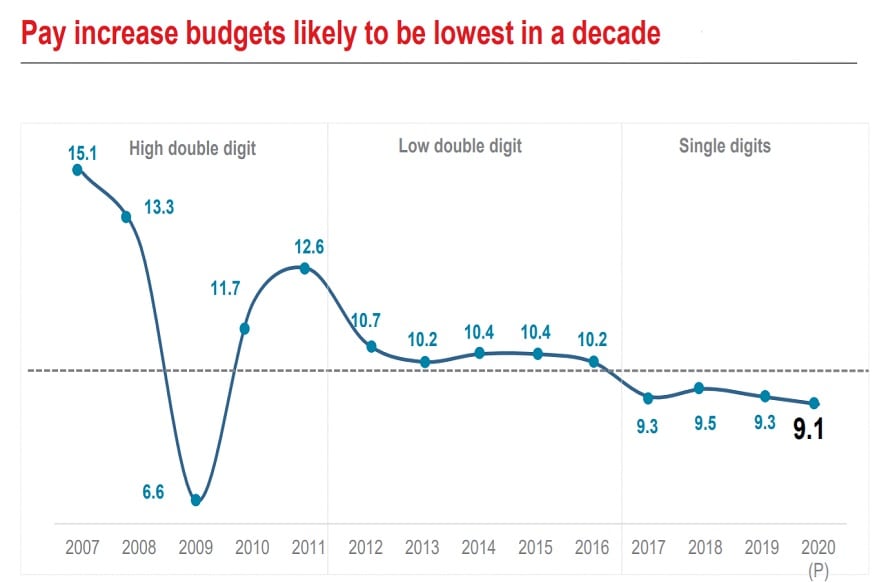 गेल्या वर्षी सर्वसाधारणपणे 9.3 टक्के एवढी पगारवाढ मिळाली होती. एशिया पॅसिफिक क्षेत्रातल्या कंपन्यांमध्ये भारतीय कंपन्या तरीही वरच्या स्थानावर राहिल्या. कारण या क्षेत्रातल्या इतर देशातल्या कंपन्यांनी याहूनही कमी पगारवाढ केली होती. यावर्षीही चित्र फारसं आशादायक नसल्याचं स्पष्ट होत आहे.