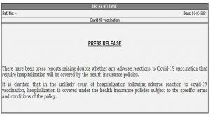 नवी दिल्ली, 19 मार्च : कोविड-19 च्या लसीकरणाबाबत (COVID-19 Vaccination) तुमच्या मनात भीती आहे, तर तुमच्यासाठी एक चांगली बातमी आहे. कोरोनाची लस घेतल्यानंतर (Corona Vaccine) जर तुमची प्रकृती खराब झाली तर रुग्णालयात केल्या जाणाऱ्या उपचाराचा खर्च विमा कंपनी उचलेल. भारतीय विमा नियामक आणि विकास प्राधिकरण (IRDAI) यांनी यासंदर्भात एक निर्देश जारी केले आहेत. भारतात 18 मार्चपर्यंत 3.08 कोटी लोकांना कोरोना लशीचा पहिला डोज देण्यात आला आहे. (insurance company cover if Patient gets sick after corona vaccination) IRDAI च्या एका विधानानुसार, जर कोरोनाच्या लसीकरणानंतर जर कोणत्याही रिअॅक्शनमुळे रुग्णालयात भर्ती व्हावं लागलं तर हा खर्च आरोग्य विमा कंपनीद्वारा कव्हर केला जाईल. कोरोनाची लस घेतल्यानंतर प्रतिकूल परिस्थितीत जर रुग्णालयात भर्ती व्हावं लाहले तर हेल्थ पॉलिसीहोल्डर्सचा खर्च कंपन्या उचलतील. हॉस्पिटेलायजेशन हेल्थ इंश्योरेन्स पॉलिसीअंतर्गत पॉलिसीच्या नियम आणि अटींमध्ये कव्हर आहे.