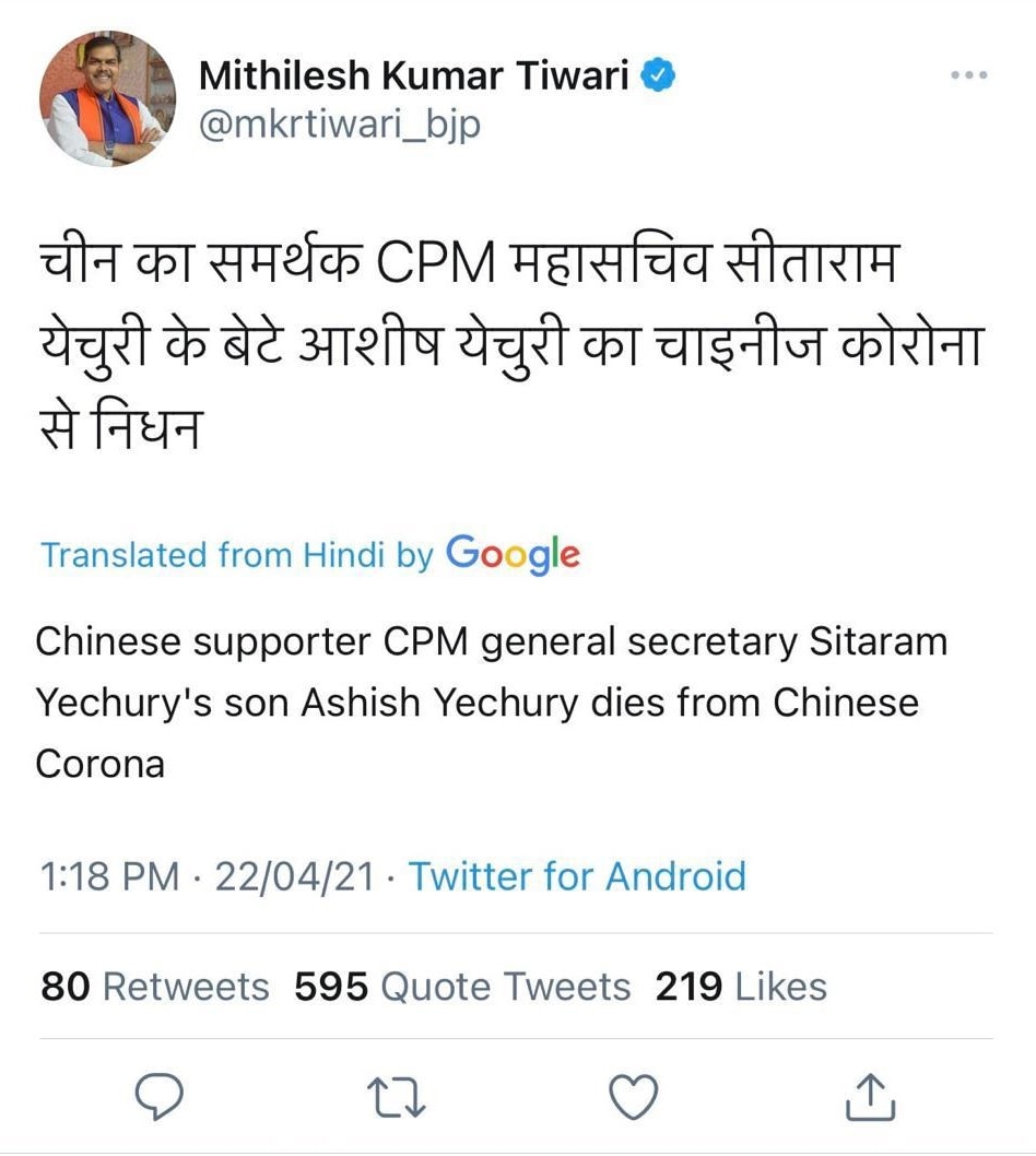 सीताराम येचुरी यांचा मोठा मुलगा आशिष हा 35 वर्षांचा होता. जवळपास दोन आठवडे त्याच्यावर उपचार सुरू होते. परिस्थितीत सुधारणा होत नसल्याने त्याला उपचारासाठी गुरुग्राम येथील मेदांता रुग्णालयात उपचारासाठी दाखल करण्यात आले होते. मात्र, दुर्दैवाने त्याचे निधन झाले. आशिष व्यतिरिक्त सीताराम येचुरी यांच्या पश्चात पत्नी आणि मुलगी आहे. आशिष येचुरी याच्या निधनानंतर दिल्लीचे मुख्यमंत्री अरविंद केजरीवाल यांनी ट्विट करुन श्रद्धांजली वाहिली. कोरोनाच्या संकटात एकिकडे नागरिक एकमेकांना आधार देत आहेत आणि शक्य होईल तितकी मदत करत आहेत. मात्र, अशा परिस्थितीतही भाजप नेता राजकारण करण्याची संधी सोडत नाहीये हे दिसून आलं. तिवारी यांनी आपलं ट्विट हटवलं असलं तरी त्याचे फोटोज सोशल मीडियात व्हायरल होत असून त्यांच्यावर टीकेची झोड उठवण्यात येत आहे.