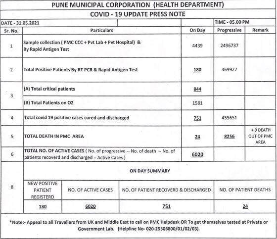 पुणे, 31 मे: काल पुण्यात गेल्या तीन (Pune Corona Update) महिन्यातील सर्वात कमी रुग्णसंख्या नोंदविण्यात आली होती. दुसऱ्याच दिवशी पुण्यातून आणखी एक चांगली बातमी समोर आली आहे. गेल्या 24 तासात पुण्यातून अवघे 180 रुग्ण पॉझिटिव्ह (Covid - 19) आले आहे. आज दिवसभरात पुण्यात 4439 चाचण्या करण्यात आल्या. त्यातून केवळ 180 जणांची कोविड चाचणी पॉझिटिव्ह आली आहे. दुसऱीकडे पॉझिटिव्ह रुग्णांच्या चौपटहून अधिक बरे होऊन घरी जाण्याऱ्यांचं प्रमाण आहे. सध्या पुण्यात पावसाचं आगमन झाल्यामुळे वातावरणात गारवा परतला आहे. त्यात गेल्या अनेक दिवसांपासून घोंगावणाऱ्या कोरोनाच्या संकटातूनही पुणेकरांना दिलासा मिळाला आहे. गेल्या 6 महिन्यातील निच्चांकी रूग्णवाढ आहे. दुसरीकडे आज पुणे शहरातील 24 बाहेरील अशा 33 जणांचा मृत्यू झाला आहे. (Good News for Punekar The lowest number of patients in the second wave in the last 24 hours)