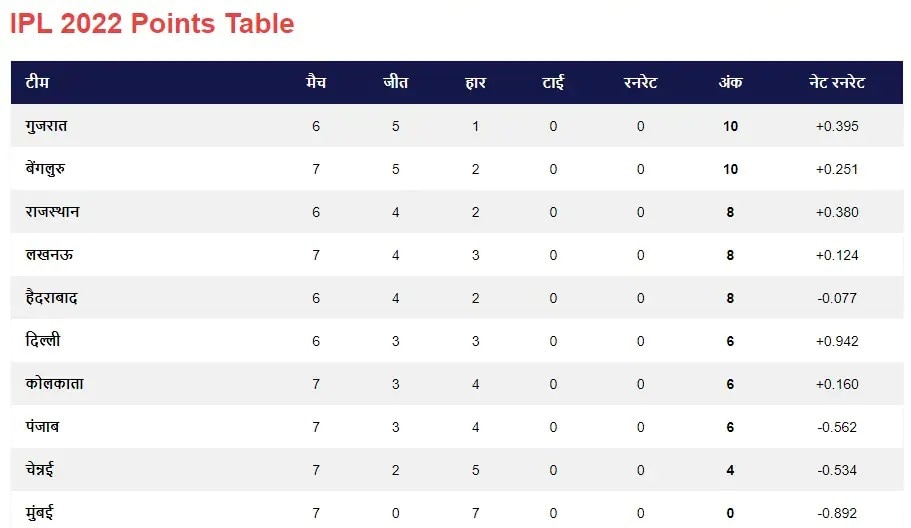 आयपीएल पॉईंट्स टेबलमध्ये गुजरात टायटन्स (Gujarat Titans) 6 मॅचनंतर 5 विजय आणि 10 पॉईंट्ससह पहिल्या क्रमांकावर आहे. तर रॉयल चॅलेंजर्स बँगलोरनं 7 मॅचनंतर 10 पॉईंट्स कमावले असून ते दुसऱ्या क्रमांकावर आहेत. त्यानंतर राजस्थान रॉयल्स आणि लखनऊ सुपर जायंट्सचा नंबर आहे. या दोन्ही टीमचे प्रत्येकी 8 पॉईंट्स आहेत. सनरायझर्स हैदराबादचेही 8 पॉईंट्स असून त्यांचा रनरेट कमी असल्यानं ते पाचव्या क्रमांकावर आहेत.दिल्ली कॅपिटल्स, कोलकाता नाईट रायडर्स आणि पंजाब किंग्ज या टीमचा त्यानंतर नंबर असून या सर्व टीमचे प्रत्येकी 6 पॉईंट्स आहेत.
