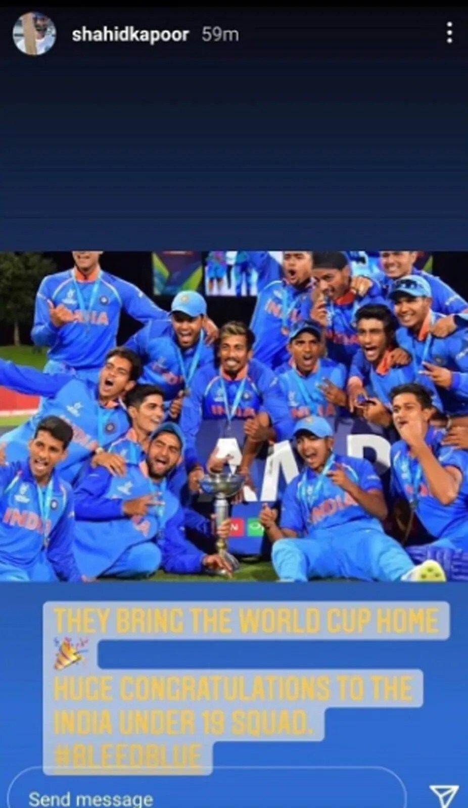 मुंबई, 7 फेब्रुवारी : भारतीय टीमनं पाचव्यांदा अंडर 19 वर्ल्ड कप (Under 19 World Cup 2022) जिंकला आहे. वेस्ट इंडिजमध्ये झालेल्या वर्ल्ड कप फायनलमध्ये टीम इंडियानं इंग्लंडचा 4 विकेट्सनं पराभव केला. भारतीय टीमनं फायनलमध्ये दमदार कामगिरी करत फायनलमध्ये इंग्लंडला 44.5 ओव्हर्समध्ये 189 रनवर रोखले. त्यानंतर 47.4 ओव्हर्समध्ये 6 विकेट्सच्या मोबदल्यात विजेतेपदासाठी आवश्यक लक्ष्य पूर्ण केले. ऐतिहासिक विजेतेपदानंतर भारतीय टीमवर सध्या अभिनंदनाचा वर्षाव होत आहे. वेगवेगळ्या क्षेत्रातील दिग्गज मंडळींनी टीमचं अभिनंदन केलं आहे. अभिनेता शाहिद कपूरनं (Shahid Kapoor) देखील भारतीय टीमचे अभिनंदन केले. त्यावेळी त्यानं एक मोठी चूक केली. या चुकीमुळे शाहिद सोशल मीडियावर सध्या ट्रोल होत आहे. शाहिदनं भारतीय टीमचं अभिनंदन करताना 2018 साली वर्ल्ड कप जिंकलेल्या अंडर 19 टीमचा फोटो शेअर केला. या फोटोमध्ये पृथ्वी शॉ, शुभमन गिल, कमलेश नागरकोटी, शिवम मावी हे खेळाडू होते. शाहिदनं नंतर ती पोस्ट टिलिट केली. पण, तोपर्यंत उशीर झाला होता. काही जणांनी या पोस्टचा स्क्रीनशॉट घेतला होता. त्यांनी शाहिदला ट्रोल केले.