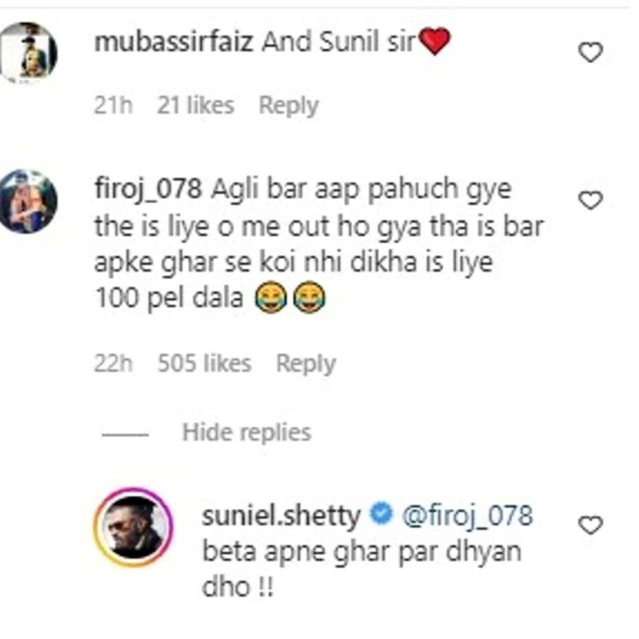 या पोस्टला राहुलच्या चाहत्याने कमेंट करत सुनिल शेट्टील ट्रोल करण्याचा प्रयत्न केला. पण सुनिल शेट्टीनी सडेतोड उत्तर दिले. नेमकं काय घडलं? सुनिल शेट्टी यांनी राहुलसाठी केलेल्या एका पोस्ट वर चाहत्याने, मागच्या खेळादरण्यात तुम्ही तिथे होत म्हणून शून्यावर बाद झाला. यावेळी तुमच्या घरातून कोणीही आले नाही, म्हणून 100*** लावा.’ अशा आशायची पोस्ट चाहत्याने सुनिल शेट्टीला ट्रोल करण्याचा प्रयत्न केला. मात्र, सुनिल शेट्टी यांनी ‘बेटा तु तुझ्या घरी लक्ष दे’ असे म्हणत सडेतोड उत्तर दिले.सध्या या दोघांचा वाद सोशल मीडियवर व्हायरल होत आहे.