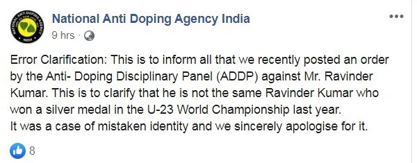 रविंदर दहियाने पीटीआयशी बोलताना याबाबत खुलासा केली. तो म्हणाला की, ज्या रविंदरवर बंदी घालण्यात आली आहे. नाडाने ज्याची माहिती दिली आहे तो मी नाही. नाडाने माझी कोणतीही चाचणी केलेली नाही. मी हवाई दलात काम केलं आहे पोलिसांत नाही. नाडाने ज्या रविंदरवर बंदी घातली होती त्याची चाचणी गेल्या वर्षी फेब्रुवारी-मार्च महिन्यात चाचणी घेतली होती. त्यावेळी जयपूरमध्ये 67 वी अखिल भारतीय कुस्ती चॅम्पियनशिप सुरू होती. नाडाने गेल्या वर्षी 14 मे रोजी रविंदर कुमारवर निलंबनाची कारवाई केली होती. कोहलीच्या रॉकेट थ्रोने किवींच्या तोंडचा घास पळवला, ‘त्या’ रनआऊटने बदलला सामना बंदी घालण्यात आलेला रविंदर कुमार वर्ल्ड चॅम्पियन नाही हे समजताच नाडाने सोशल मीडियावर माफी मागत स्पष्टीकरण दिलं. नाडाने म्हटलं की, बंदी घालण्यात आलेला रविंदर कुमार आणि अंडर 23 वर्ल्ड चॅम्पियनशिपमध्ये रौप्य पदक जिंकलेला रविंदर दोन्ही एक नाहीत. चुकीच्या माहितीमुळे असे झाले. VIDEO : …आणि श्रेयस अय्यरसह टीम इंडियाची यंग ब्रिगेड झाली ‘स्ट्रीट डान्सर’