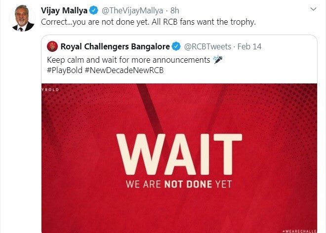 नवी दिल्ली, 15 फेब्रुवारी : आयपीएलच्या 13 व्या हंगामाची चर्चा आतापासून सुरू झाली आहे. फक्त काही महिने बाकी राहिले आहेत. लिलावानंतर संघ तयारीला लागले आहेत. रॉयल चॅलेंजर्स बेंगलोरने आयपीएलच्या या हंगामासाठी लोगोपासून जर्सीपर्यंत अनेक बदल केले आहेत. संघाच्या या निर्णयावर आरसीबीचे सुरुवातीचे मालक विजय मल्ल्या यांनी पहिल्यांदा खिल्ली उडवली. त्यांनी ट्विट करून म्हटलं की, ट्रॉफीसुद्धा जिंका. चाहते त्या क्षणाची वाट बघत आहेत. आरसीबीला आजपर्यंत एकदाही विजेतेपद जिंकता आलेलं नाही. माल्ल्या यांनी म्हटलं की, विराट कोहली अंडर 19 संघातून आरसीबीमध्ये आला होता. विराटच्या नेतृत्वाखाली टीम इंडियाने यशाची अनेक शिखरं गाठली. त्यानंही सर्वोत्तम कामगिरी केली. आता कोहलीला सोडा म्हणजे त्याला स्वातंत्र्य द्या. आरसीबीचे सर्व चाहते ट्रॉफीची वाट बघत आहेत. रॉयल चॅलेंजर्स बेंगलोरचे या हंगामाचे स्पॉन्सर मुथुट फिनकॉर्प हे आहेत. यामुळे संघाने लोगोमध्ये बदल केला आहे. शुक्रवारी लोगोचे अनावरण करण्यात आले. आरसीबीने म्हटलं की, तुम्हाला ज्याची प्रतिक्षा होती ते हे आहे. नवं दशक, नवीन आरसीबी आणि नवा लोगो.