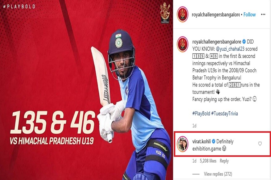 ‘यूपीच्या खेळाडूंना टीम इंडियात संधी नव्हत्या पण…’, भारतीय माजी खेळाडूचे विधान यावर रॉयल चॅलेंजर्स बंगळुरू संघाचा कर्णधार विराट कोहलीने चहलला ट्रोल केलं आहे. या पोस्टवर कोहलीनं निश्चितच, आम्ही नक्कीच प्रदर्शन करणाऱ्या मॅचमध्ये याचा विचार करू, असे म्हणत चहलला ट्रोल केलं आहे. सध्या कोरोना व्हायरसमुळं भारतात लॉकडाऊन जाहीर करण्यात आला आहे. यामुळं 2020मध्ये होणारी आयपीएल स्पर्धाही रद्द होण्याच्या मार्गावर आहे. सध्या आयपीएल ही स्पर्धा अनिश्चित काळासाठी स्थगित करण्यात आली आहे. त्यामुळं सर्व खेळाडू सध्या आपल्या घरातच कैद आहेत. वाचा-
