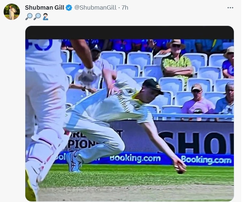 लंडन, 11 जून : वर्ल्ड टेस्ट चॅम्पियनशिपच्या फायनलमध्ये चौथ्या दिवशी शुभमन गिलला थर्ड अंपायरनी बाद दिल्याचा वाद सध्या रंगला आहे. शुभमन गिलचा झेल कॅमेरून ग्रीनने घेतला. पण चेंडू मैदानावर टेकल्याचं म्हटलं जात आहे. गिलने डीआरएस घेतल्यानंतर रिप्लेमध्ये स्पष्ट दिसत नव्हते तरी मैदानी पंचांचा निर्णय कायम ठेवत गिलला बाद ठरवण्यात आले. दरम्यान, यावर शुभमन गिलने सोशल मीडियावर पोस्ट करून दिलेल्या प्रतिक्रियेमुळे त्याच्या अडचणीत भर पडू शकते. त्याने पंचांच्या निर्णयावर प्रश्न उपस्थित केला आहे. गिलने केलेल्या या पोस्टमुळे त्याच्यावर आयसीसीच्या आचारसंहितेचं उल्लंघन केल्याप्रकरणी कारवाई होऊ शकते. त्याच्यावर काय कारवाई होणार हे आता आयसीसी कशा पद्धतीने दखल घेते त्यावर अवलंबून आहे. शुभमन गिलने सामन्यानंतर त्याच्या झेलबादच्या निर्णयाविरुद्ध ट्विटर आणि इन्स्टाग्रामवर एक पोस्ट केली आहे. शुभमन गिलने कॅमेरून ग्रीन झेल घेत असलेला फोटो शेअर केला आहे. त्यात कॅप्शनमध्ये दोन भिंगाच्या काचांचे इमोजी आणि डोक्यावर हात मारलेला इमोजी टाकला आहे. त्याने इन्स्टाग्रामवर टाळ्या वाजवत असलेले इमोजी पोस्ट केले आहेत.