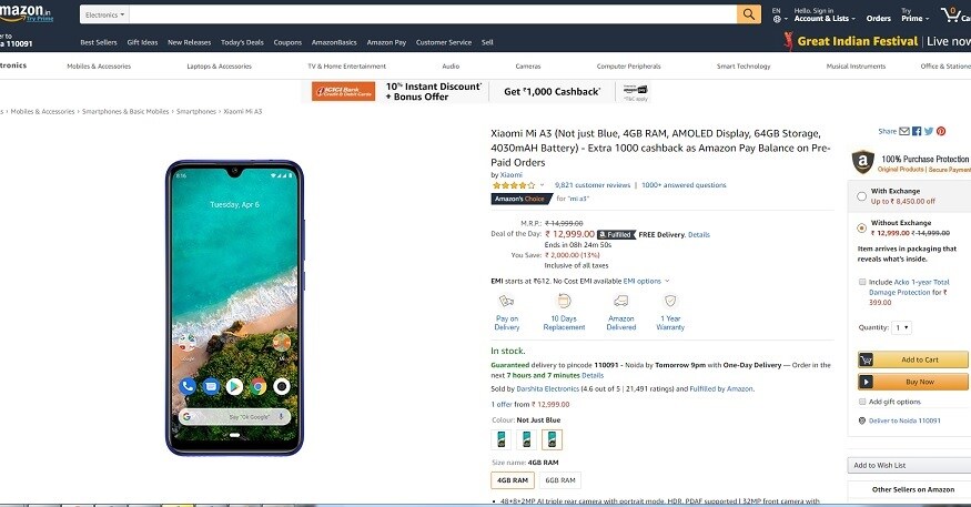 मुंबई, 14 ऑक्टोबर : अॅमेझॉनवर दुसऱ्यांदा Amazon Great Indian Festival सेल सुरू झाला आहे. या सेलला 13 ऑक्टोबरला सुरूवात झाली असून 17 ऑक्टोबरपर्यंत हा सेल आहे. यामध्ये रिअलमी, ओप्पो, सॅमसंग, शाओमी या कंपन्यांच्या स्मार्टफोनवर जबरदस्त ऑफर आणि मोठी सूट दिली जात आहे. स्मार्टफोनच्या यादीत शाओमीच्या लोकप्रिय Mi A3 च्या खरेदीवर तब्बल 8,450 रुपयांची सूट मिळू शकते. ही सवलत फक्त एक्सचेंज ऑफर अंतर्गत दिली जाणार आहे. Xiaomi च्या Mi A3 4 जीबी रॅम आणि 64 जीबी स्टोरेजच्या फोनची किंमत 14,999 रुपये आहे. तो 12,999 रुपयांत खरेदी करता येऊ शकतो. यावर सध्या 2,000 रुपयांचा फ्लॅट डिस्काउंट दिला जात आहे. त्याशिवाय अॅमेझॉन पे बॅलन्सवर 1 हजार रुपयांची कॅशबॅक ऑफरही आहे. तसेच एक्सचेंज ऑफरमध्ये 8 हजार 450 रुपयांची सवलत दिली जात आहे.