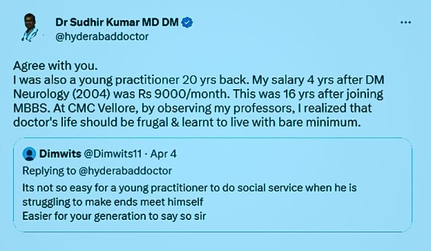 मुंबई, 08 एप्रिल: एखाद्या खासगी हॉस्पिटलमध्ये काम करणाऱ्या डॉक्टरचा पगार सध्याच्या काळात लाखांच्या घरात सहज असतो. सरकारी हॉस्पिटलमध्ये डॉक्टरांना चांगला पगार मिळतो; पण तुम्हाला जाणून आश्यर्च वाटेल की, जवळपास 16 वर्षांपूर्वी एमबीबीएस झालेल्या डॉक्टरचा पगार हा एखाद्या शिपायाला मिळणाऱ्या पगाराएवढा होता! विश्वास बसत नसला तरी हे खरं आहे. ‘झी न्यूज हिंदी’ने याबाबतचं वृत्त दिलंय. अपोलो हॉस्पिटल्सचे न्यूरोलॉजिस्ट डॉ. सुधीर कुमार यांचं एक ट्विट सध्या चर्चेत आहे. या ट्विटमध्ये त्यांनी म्हटलं आहे की, ‘16 वर्षांपूर्वी एमबीबीएस पूर्ण केल्यानंतरही मला 9,000 रुपये पगार मिळत होता. हा पगार तेव्हाचा आहे, जेव्हा मला डीएमची पदवी घेऊनसुद्धा 4 वर्षं पूर्ण झाली होती. 2004 मध्ये माझा पगार महिन्याला 9000 रुपये होता. सीएमसी वेल्लोर इथल्या प्राध्यापकांना पाहून मला नेहमी वाटायचं, की डॉक्टरांचं आयुष्य कमी खर्चिक असावं.’ डॉक्टरांच्या ट्विटवर कमेंट्सचा पाऊस डॉ. सुधीर कुमार यांच्या या पोस्टवर मोठ्या प्रमाणात कमेंट येत आहेत. अनेक युजर्सनी भावनिक प्रतिक्रिया दिल्या आहेत. त्या काळात पीएचडीसाठी आठ हजार रुपयांची शिष्यवृत्ती मिळत होती, असं एका युझरने म्हटलं आहे. आजच्या काळात कमी पगारात जगणं सोपं नाही, अशीही एक कमेंट या पोस्टवर आली आहे. आणखी एका युझरने लिहिलं आहे, की, आज खासगी हॉस्पिटलकडून डॉक्टर आणि रुग्ण अशा दोघांची लूट केली जातेय. म्हणून केलं होतं ट्विट न्यूरोलॉजिस्ट डॉ. सुधीर कुमार यांनी एका तरुणाच्या पोस्टला उत्तर देताना हे ट्विट केलं होतं. या तरुणानं पोस्ट केली होती की, ‘तरुण व्यावसायिकाला समाजसेवा करणं खूप कठीण असतं. जेव्हा तो स्वत:ला सिद्ध करण्यासाठी धडपडत असतो, तेव्हा ते अधिक कठीण असतं.’ या पोस्टला उत्तर देताना सुधीर कुमार यांनी एक ट्विट केलं होतं. ते वेगानं व्हायरल झालं. तसंच त्यानंतर डॉ. सुधीर कुमार यांनी पुन्हा एक ट्विट केलं. त्यामध्ये त्यांनी म्हटलं आहे, की ‘मी त्या पगारावर खूश होतो; मात्र मला सरकारी कार्यालयात शिपायाइतकाच पगार मिळतो, हे पाहून माझ्या आईला वाईट वाटायचे. कारण माझ्या आईने मला शाळेत 12 वर्षं कठोर परिश्रम करताना पाहिलं होतं. यानंतर मी 12 वर्षं एमबीबीएस, एमडी आणि डीएम करण्यासाठी वेळ दिला होता.’ दरम्यान, सध्या डॉक्टरांच्या पगाराचे आकडे खूपच चांगले आहेत; पण अवघ्या 16 वर्षापूर्वी डॉक्टरांचा पगार पाचअंकीसुद्धा नव्हता, हेच डॉ. सुधीर कुमार यांच्या ट्विटवरून दिसून येतंय.