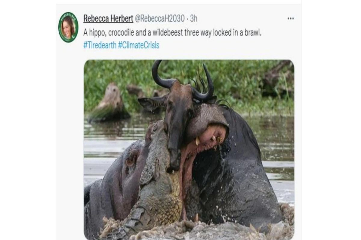 व्हायरल झालेल्या या फोटोमध्ये (Viral Photo) एकसोबतच तीन प्राणी एकमेकांवर हल्ला करताना दिसले. फोटोमध्ये मगरीसोबतच पाणघोडा आणि जंगली म्हैस दिसत आहे. हे तिघेही एकमेकांवर हल्ला करताना दिसत आहेत. तिघांचा हा फोटो पाहून नेटकरीही गोंधळले आहेत. कारण हे तिघंही नेमकं काय करतायेत असा प्रश्न त्यांना पडला आहे. या फोटोमध्ये म्हशीची मान मगरीनं धरल्याचं दिसून येतं. तर, म्हशीनं पाणघोड्यावर हल्ला केला आहे. दुसरीकडे पाणघोडा मगरीचा गळा आवळण्याच्या प्रयत्नात आहे. हे तिन्ही प्राणी एकमेकांवर हल्ला करताना दिसत आहेत. हा फोटो पाहून अनेकजण गोंधळले आहेत. नक्की इथे चाललंय काय? असा प्रश्न अनेकांना पडला आहे.