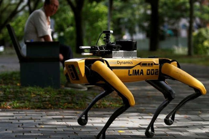 सिंगापूरमधीळ एका पार्कमध्ये पेट्रोलिंग करताना हा चार पाय असणारा SPOT नावाचा रोबो दिसून येत आहे. सोशल डिस्टंन्सिंगचा अँबॅसिडर म्हणून हा रोबो काम करत आहे. (8 मे 2020- REUTERS/Edgar Su)