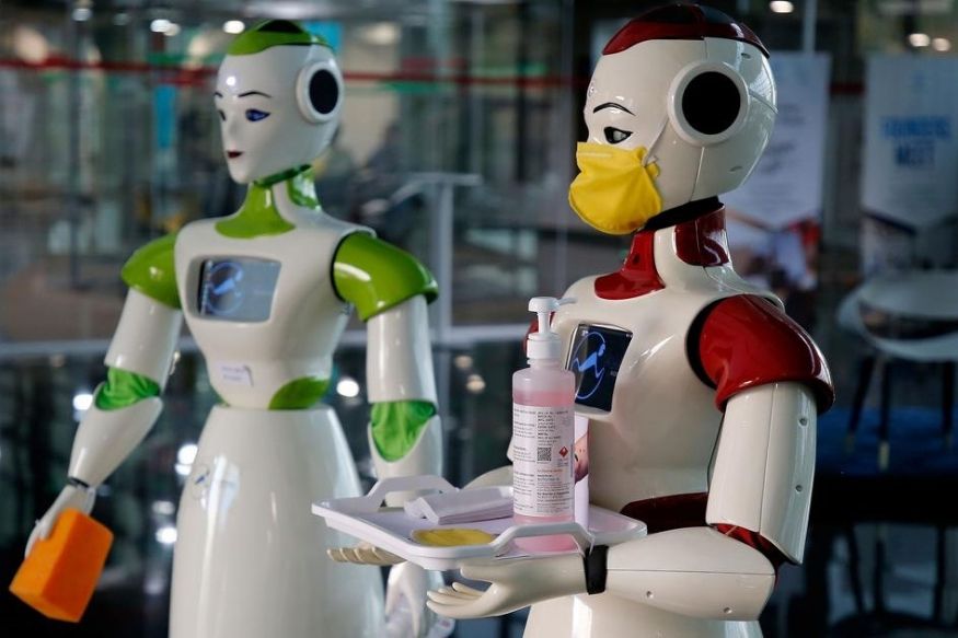 कोचीमध्ये कोरोना व्हायरसचा प्रसार कसा रोखावा याची माहिती देण्यासाठी हे दोन रोबो असिमोव रोबोटिक्स या स्टार्टअप कंपनीने तयार केले होते. या फोटोत दोन रोबो दिसून येत असून हातामधील ट्रेमध्ये सॅनिटायजर आणि मास्क दिसून येत आहेत. याचबरोबर रोबाने देखील मास्क घातल्याचे या फोटोत दिसून येत आहे. (17 मार्च 2020-REUTERS/SivaramV)