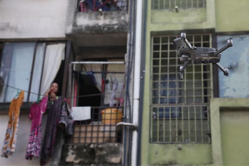 मार्च 2020 मध्ये मलेशियाच्या क्वालालंपूरमध्ये घेतलेल्या या फोटोत एक महिला ड्रोनकडे पाहताना दिसून येत आहे. कोरोना व्हायरसच्या उद्रेकाच्या पार्श्वभूमीवर नागरिकंना घरात राहण्याचे आवाहन करण्यात आले होते. त्यासाठी ड्रोनच्या माध्यमातून नागरिकांवर पोलीस नजर ठेवत होते. (REUTERS/Lim Huey Teng)