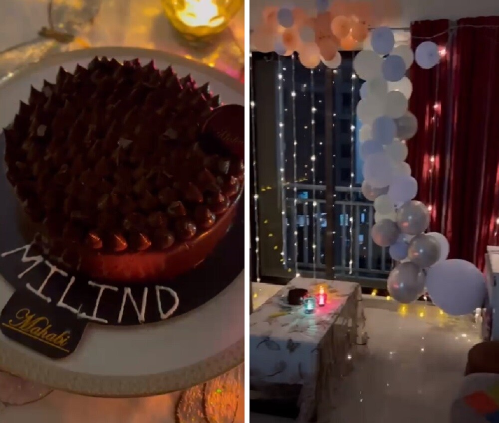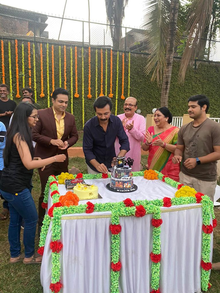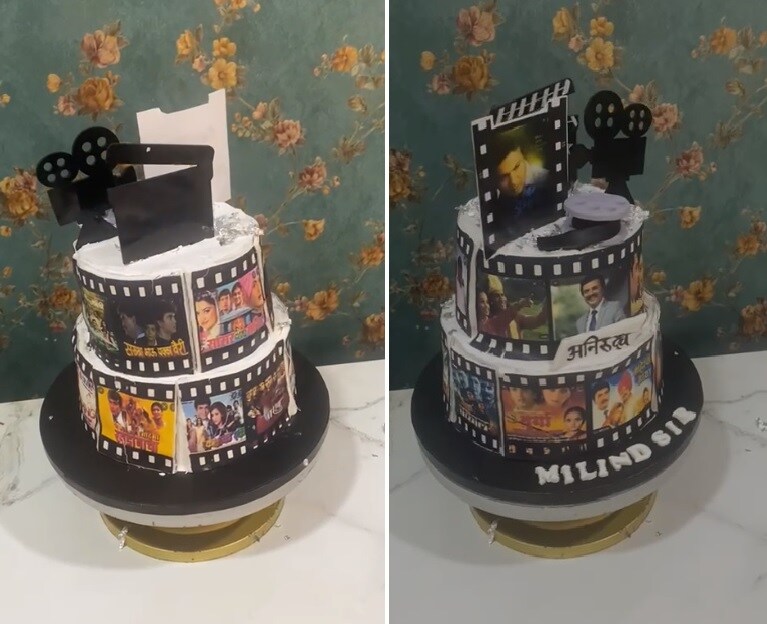 मिलिंदसाठी दोन थरांचा केक आणण्यात आला होता. ज्यावर त्यांनी आतापर्यंत केलेल्या सिनेमांचे फोटो लावण्यात आले होते.