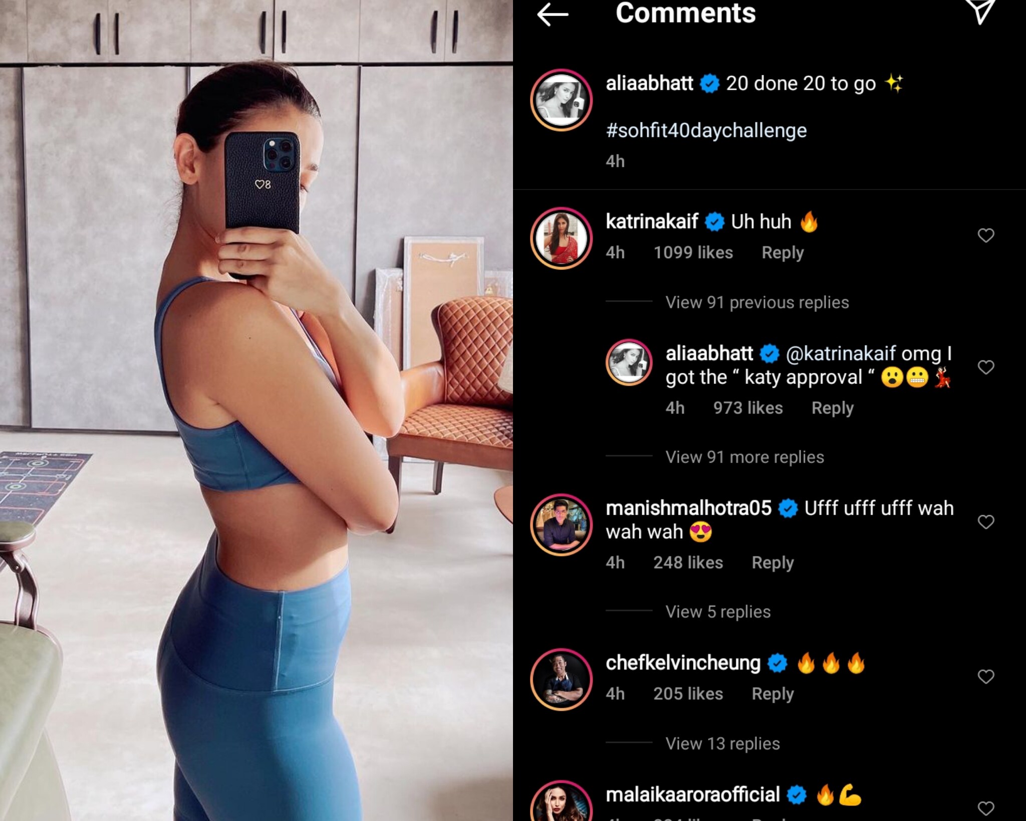 आलियाच्या या फोटोवर अनेक सेलिब्रिटींनी कमेंट करत कौतुक केलं तर कतरिना कैफनेही तिचं कौतुक केलं आहे. तिने 'उफ..हुह..' असं लिहीत फायर इमोजी लिहिलं आहे. व आलियानेही त्यावर रिप्लाय देत, 'ओएमजी, मला कॅटीचं प्रमाणपत्र मिळालं.' असं लिहिलं आहे.